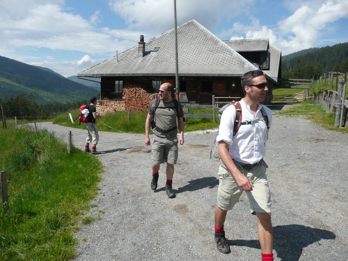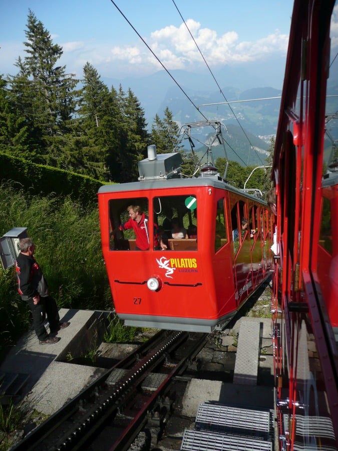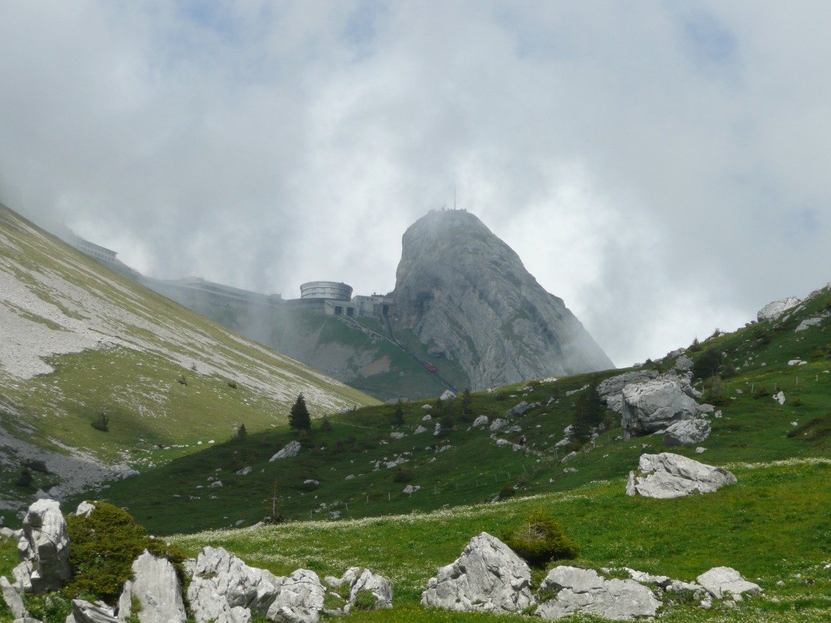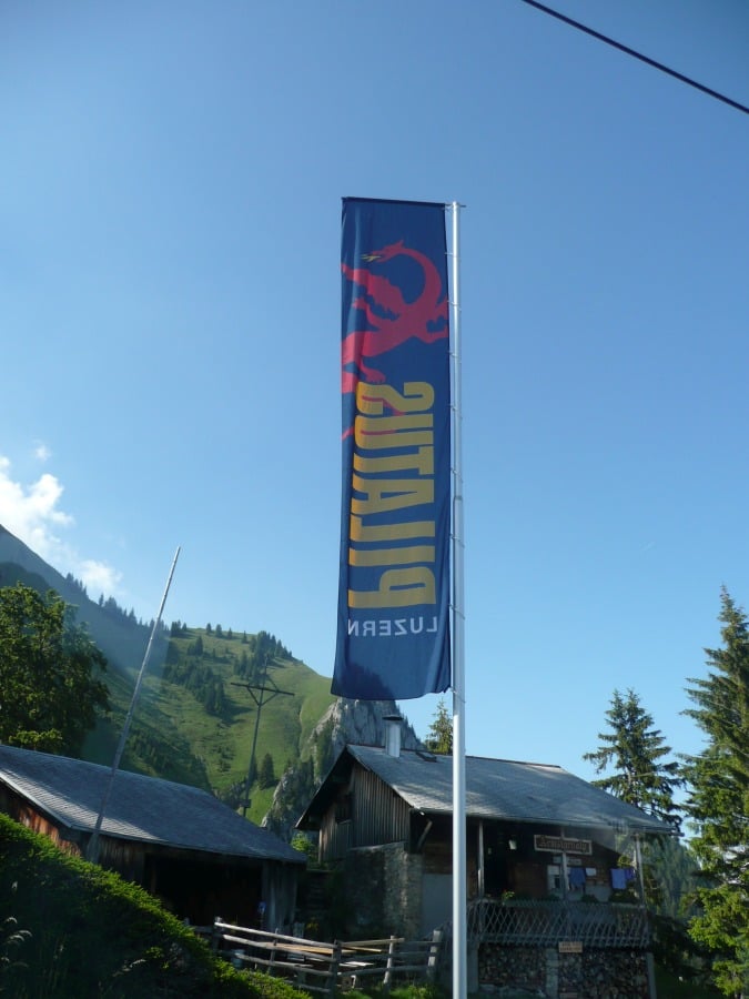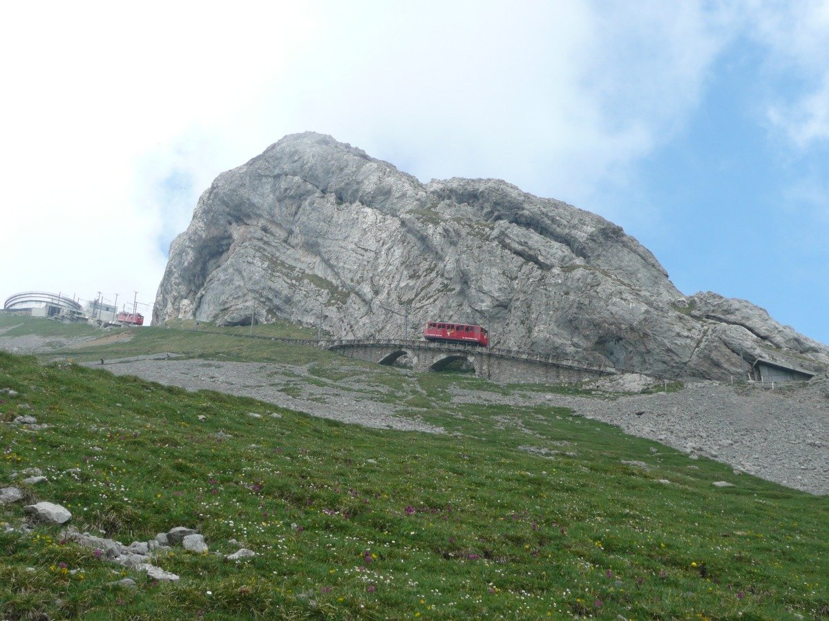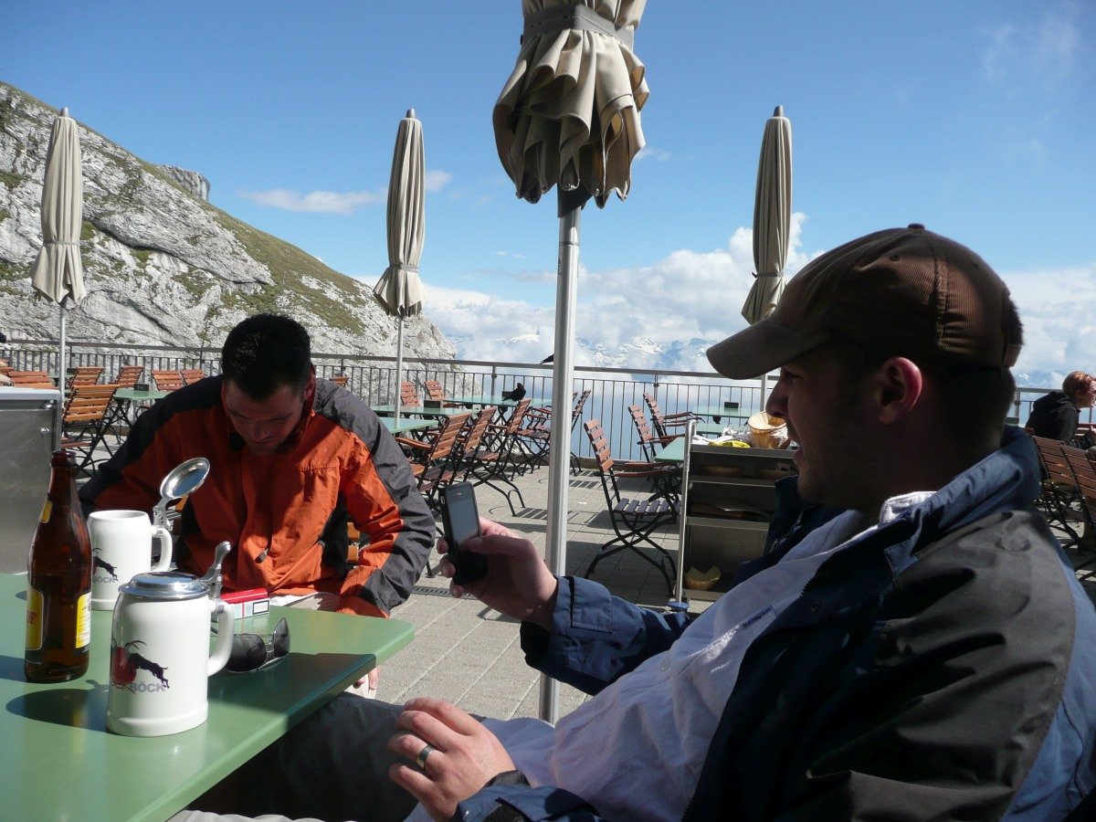 In der Lütholdsmatt machen wir Rast und beraten uns wies weiter gehen soll. Der Weg auf den Pilatus ist noch weit und das Wetter nicht mehr sehr sicher. Ein freundlicher Älpler bietet uns an, uns im Auto bis zum "Laub" zu fahren. So sparen wir 4 km oder eine Stunde Aufstieg. Vom Laub wandern wir das letzte Stück bis auf den Pilatus-Kulm. Nach dem wohlverdienten Gipfel-Bier fahren wir mit der steilsten Zahnradbahn der Welt hinunter nach Alpnach.
