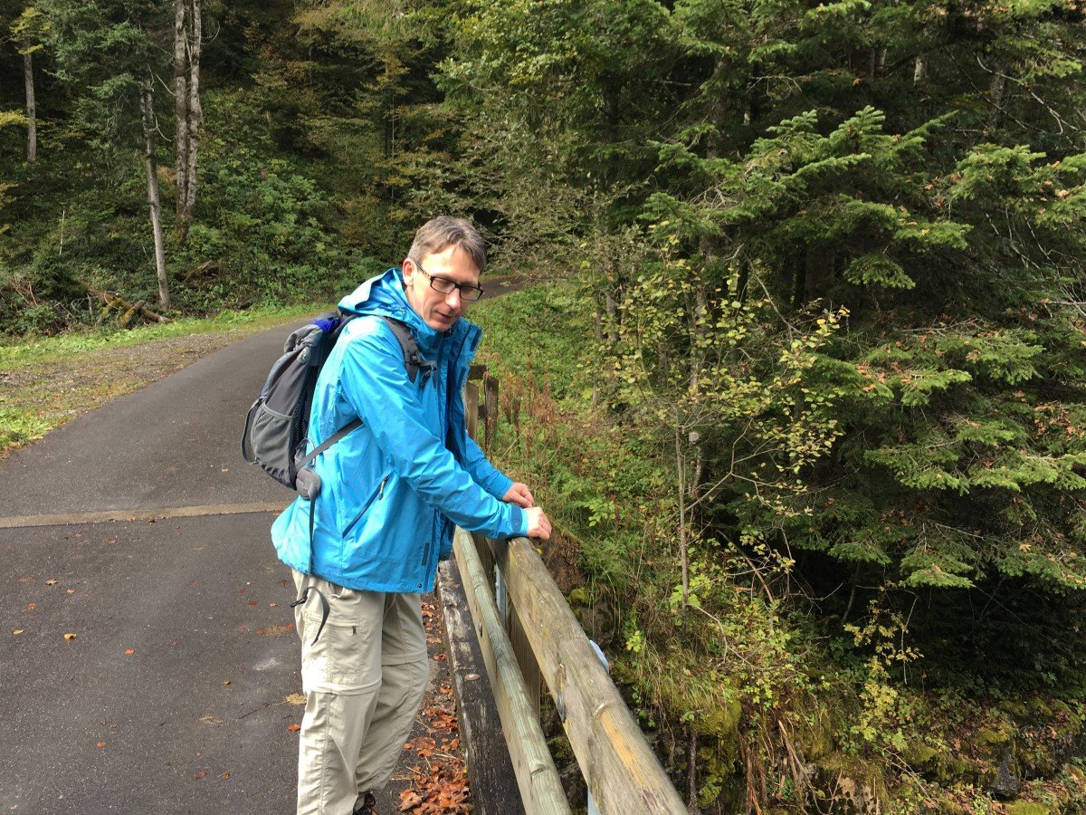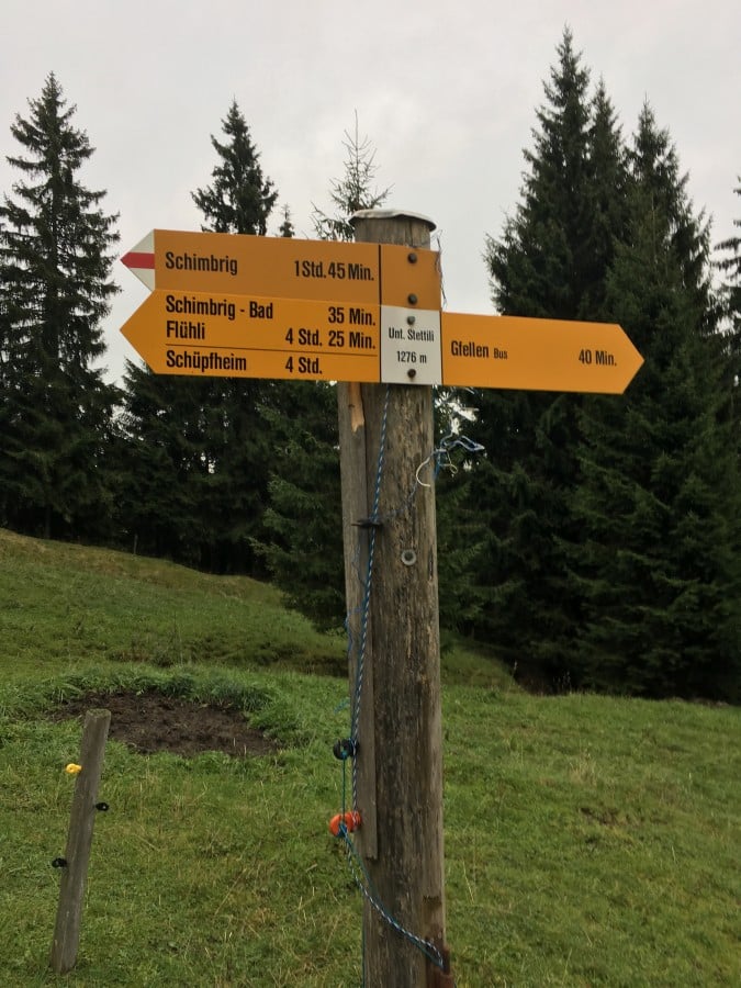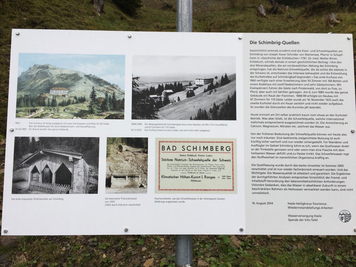 Petrus meinte es gut mit uns und der Regen hörte pünktlich zum Start unserer Wanderung auf. Vom Gfellen wanderten wir zu der alten, neu gefassten Schwefelquelle beim Schimbrig - Bad. An diesem Ort kurierten sich in früheren Tagen vermögende Gäste aus aller Welt. Die Bodenplatte des ehemaligen Kurhauses ist noch deutlich erkennbar.