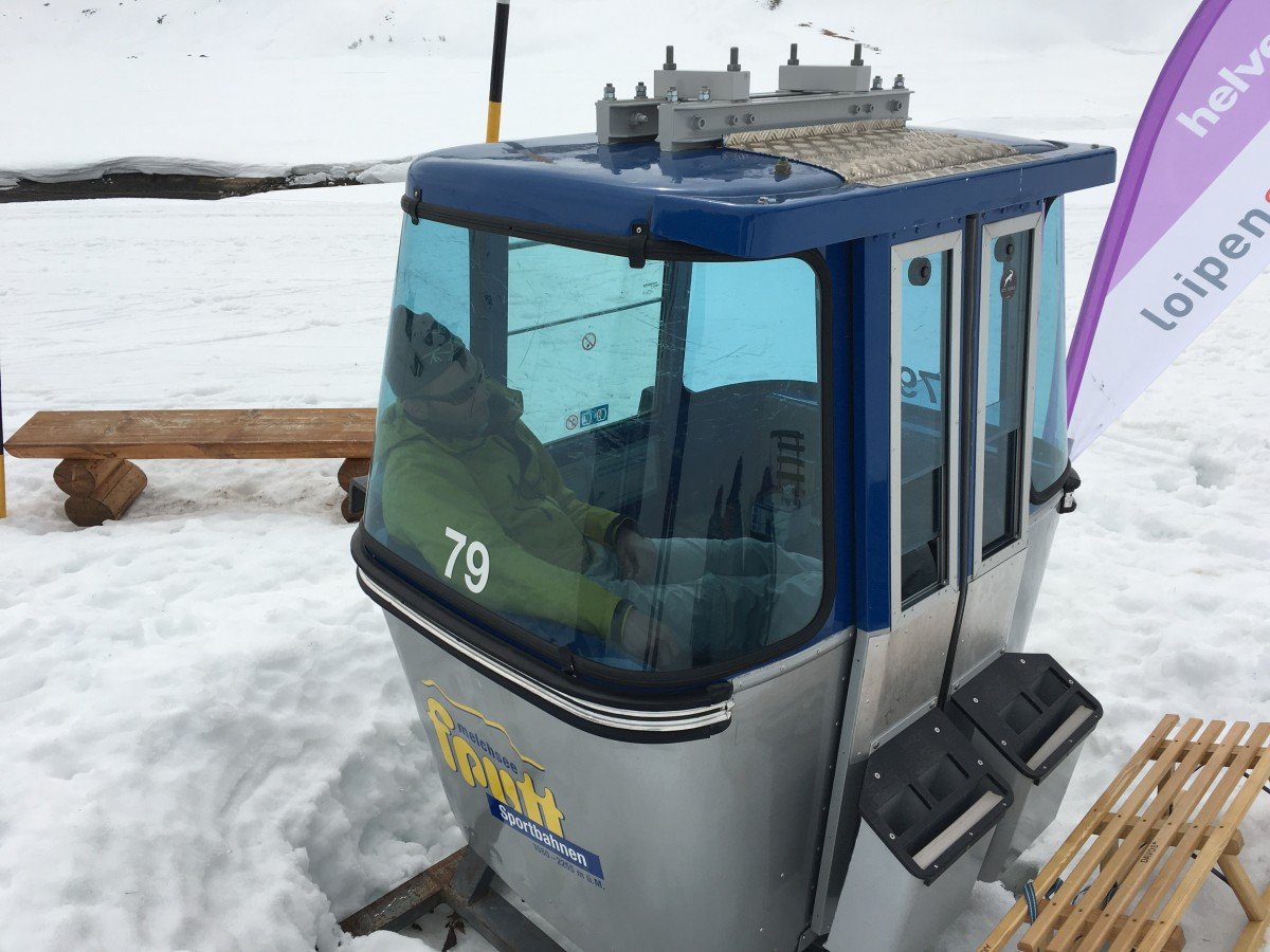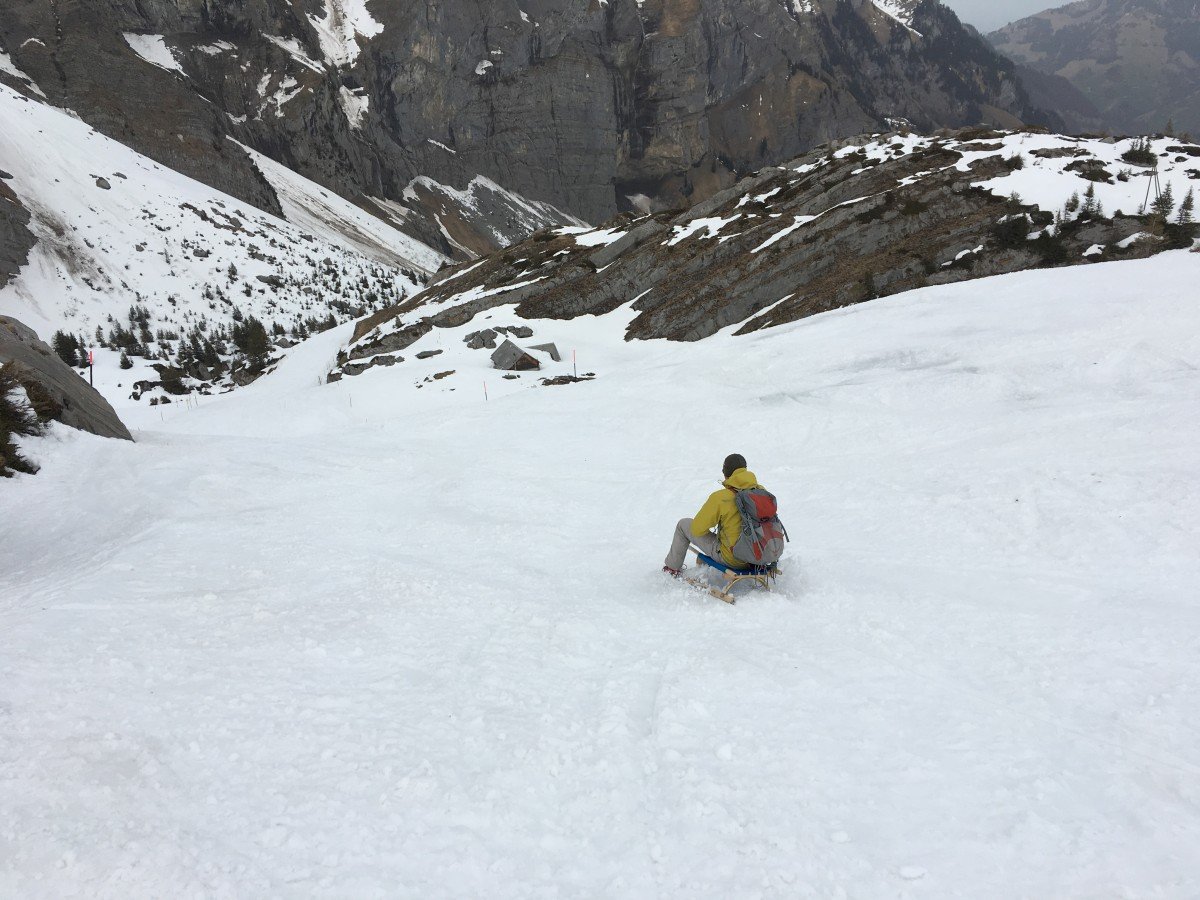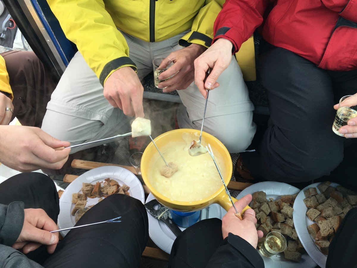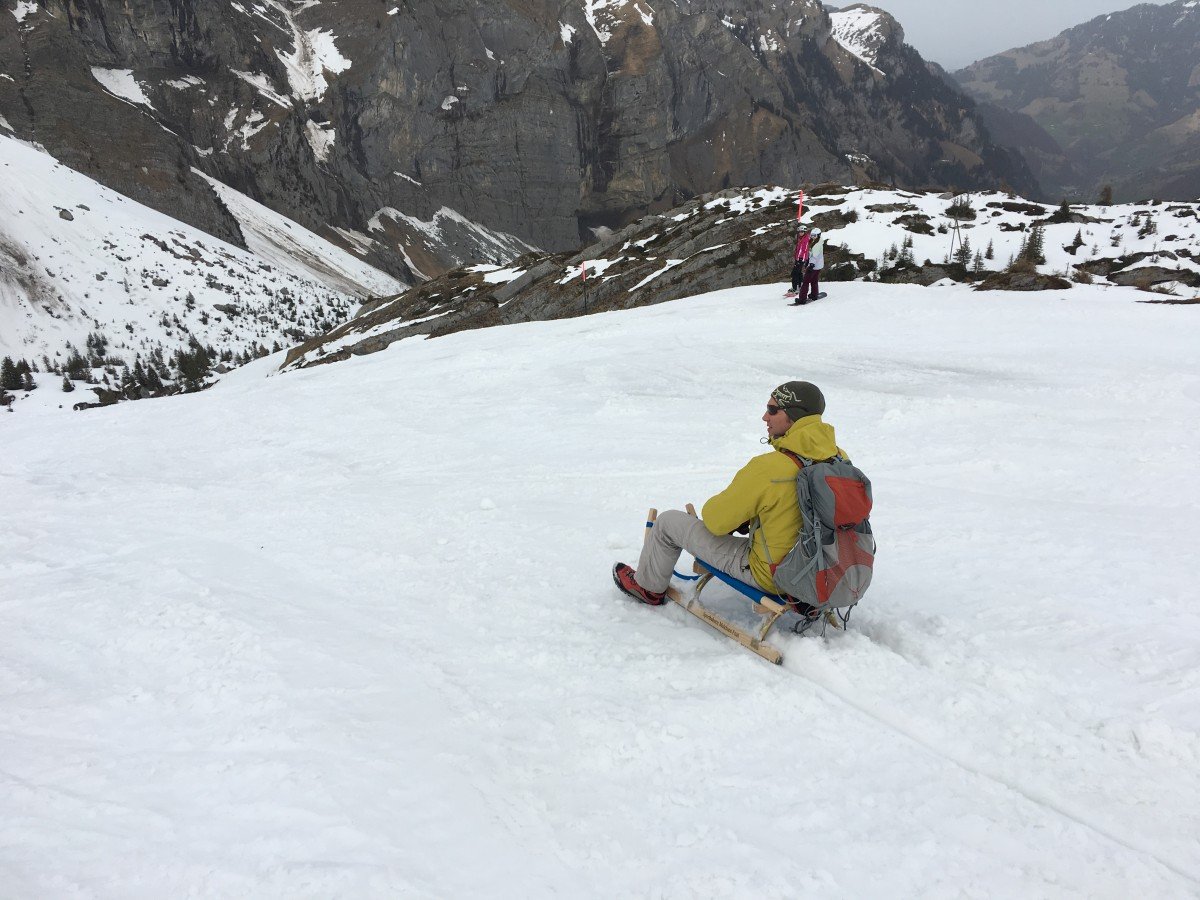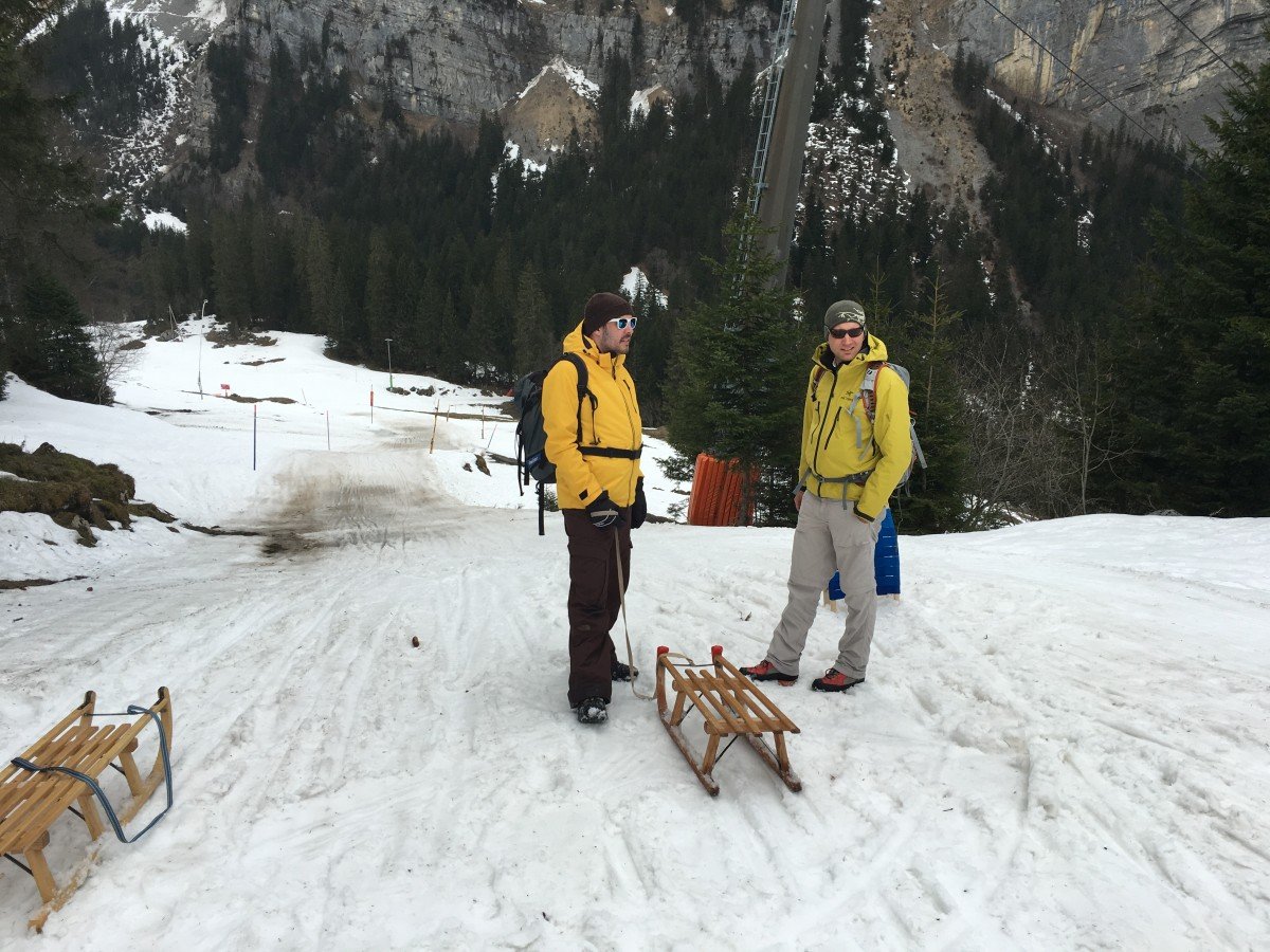 Nach kurzer Zeit wurde es uns zu bunt und wir wanderten dem See entlang wo wir zwei altgediente Gondeln fanden. Perfekt für ein feines Pistenfondue trotz bissigem Wind. Mit dem Schlitten gings danach über die Cheselen zurück in die Stöckalp.