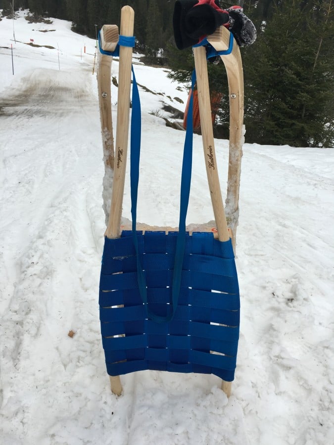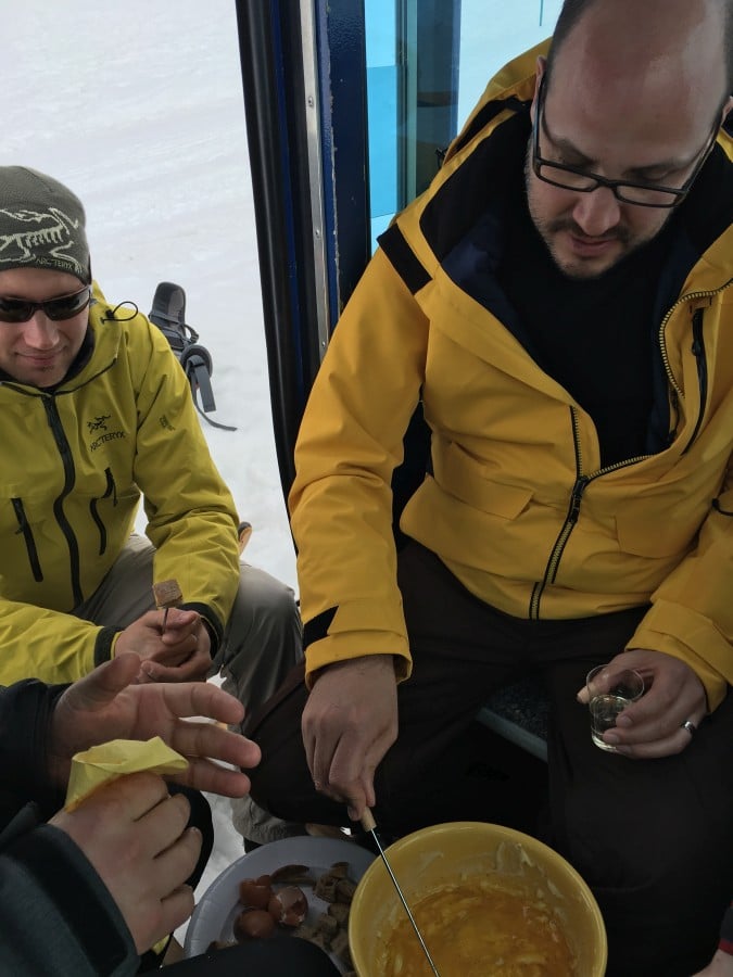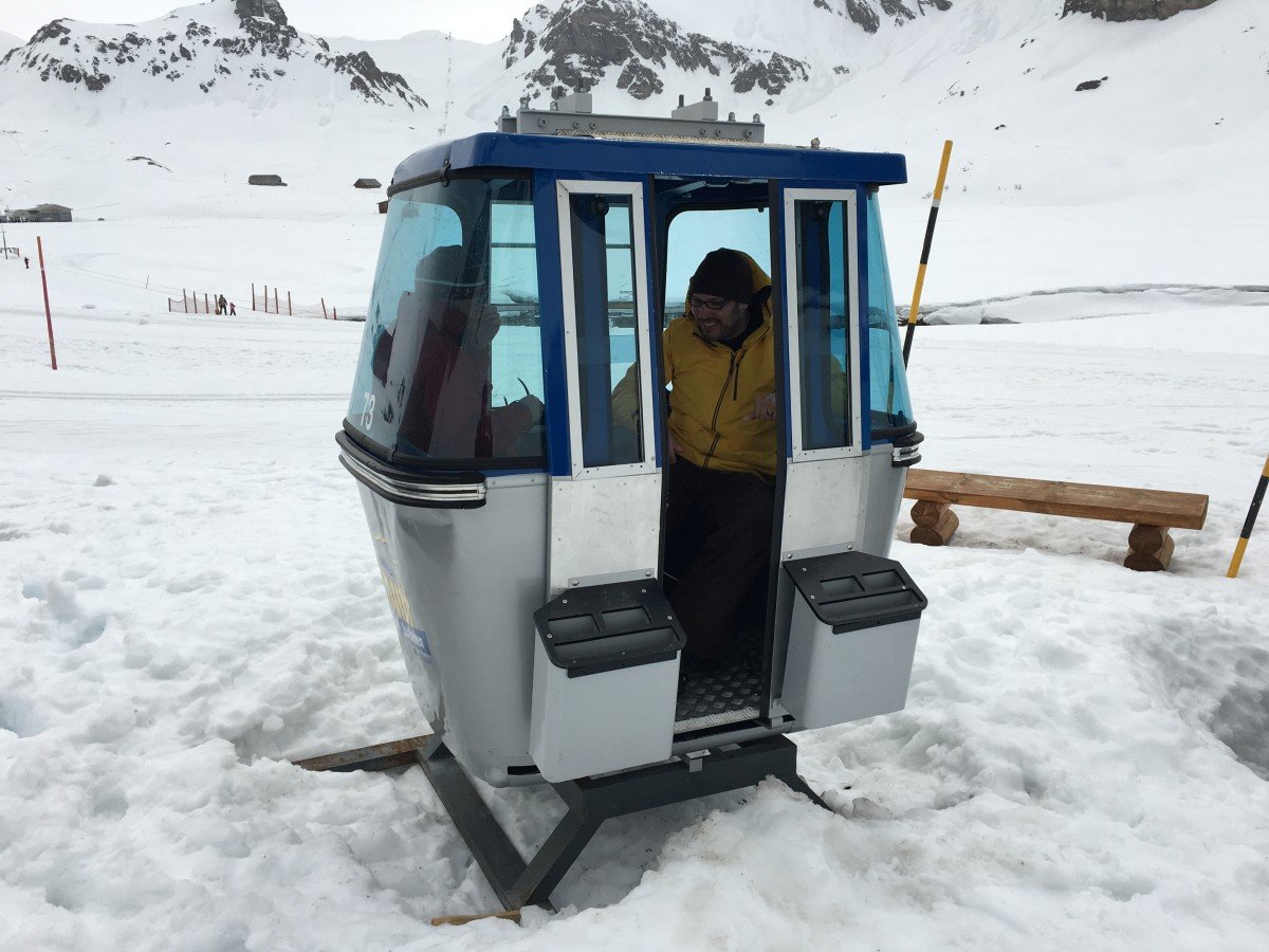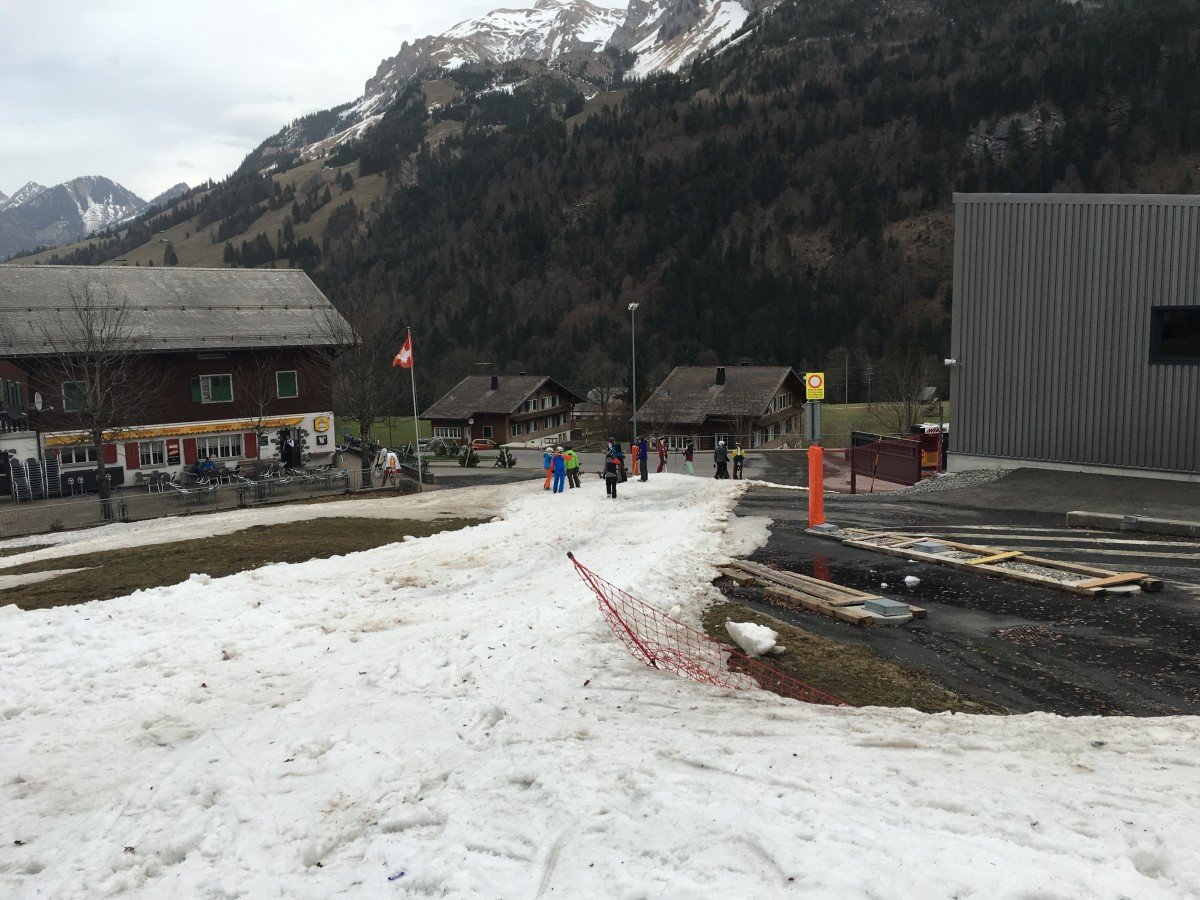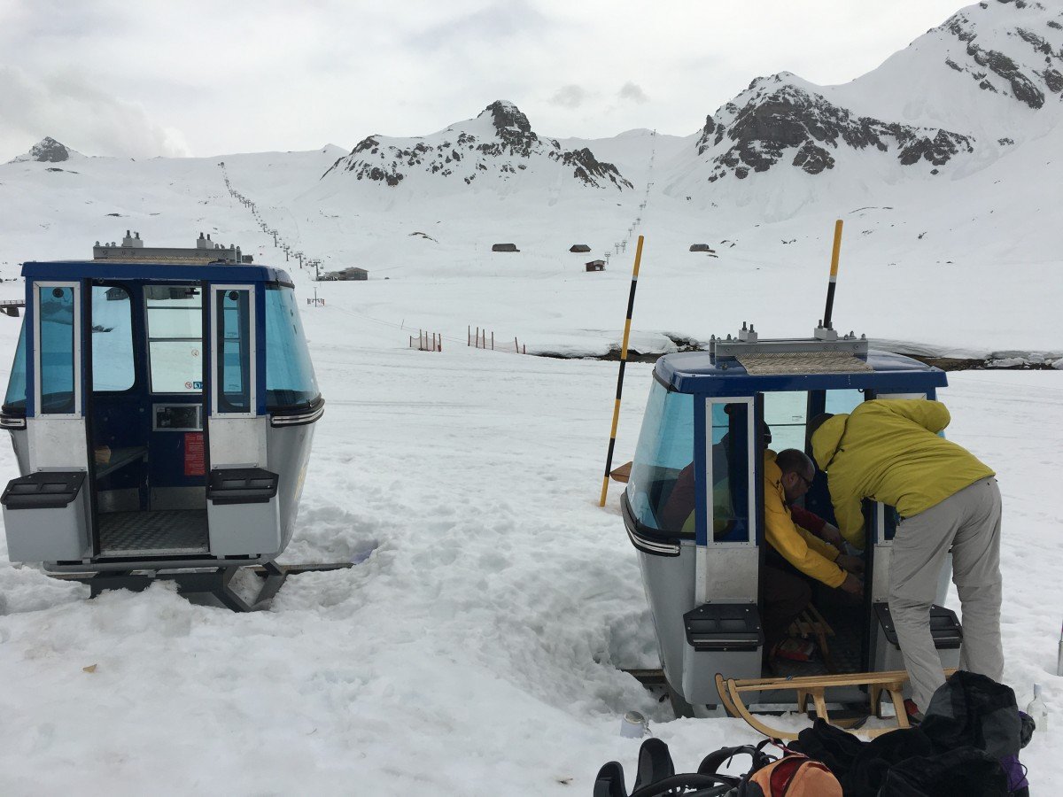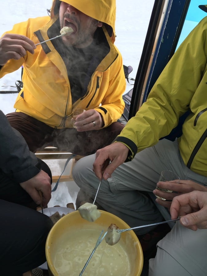 Nach kurzer Zeit wurde es uns zu bunt und wir wanderten dem See entlang wo wir zwei altgediente Gondeln fanden. Perfekt für ein feines Pistenfondue trotz bissigem Wind. Mit dem Schlitten gings danach über die Cheselen zurück in die Stöckalp.