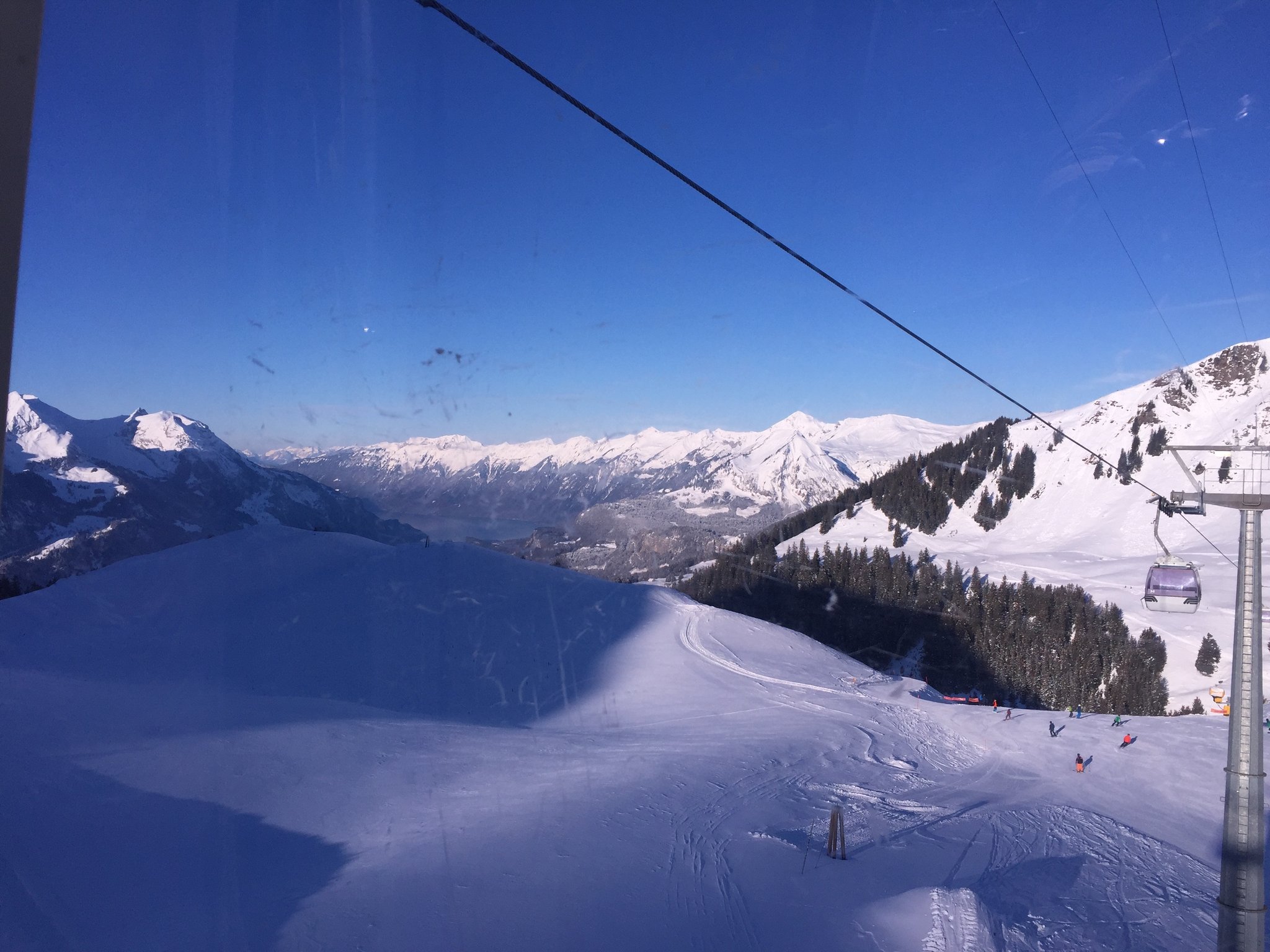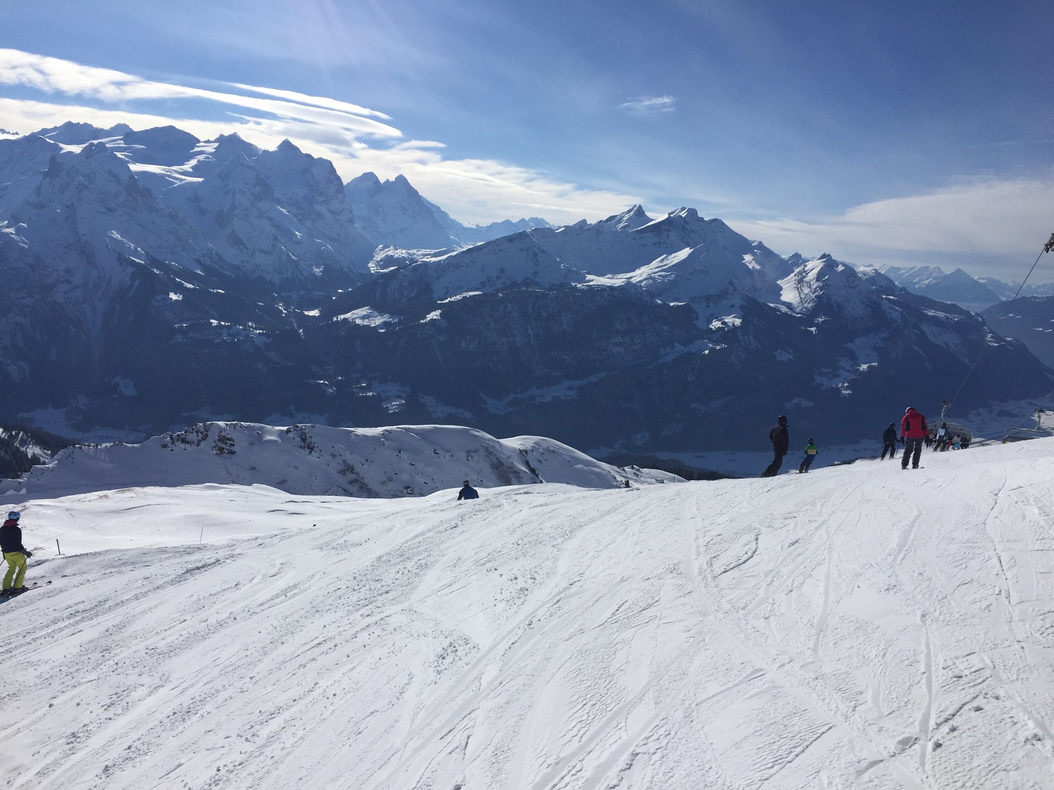 Eine Kleinformation der Rotsockböck, bestehend aus Eichibock und Simibock geniessen gemeinsam den Skitag in Meiringen-Hasliberg.
