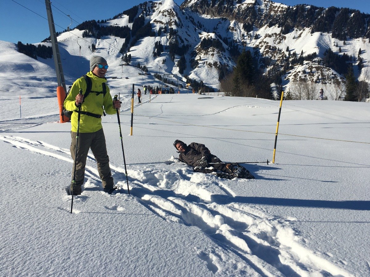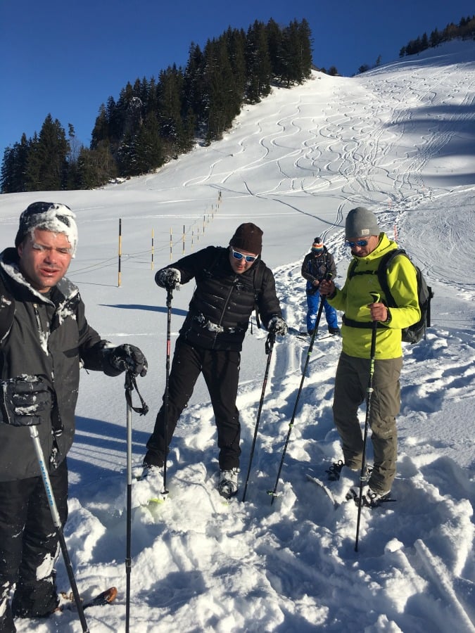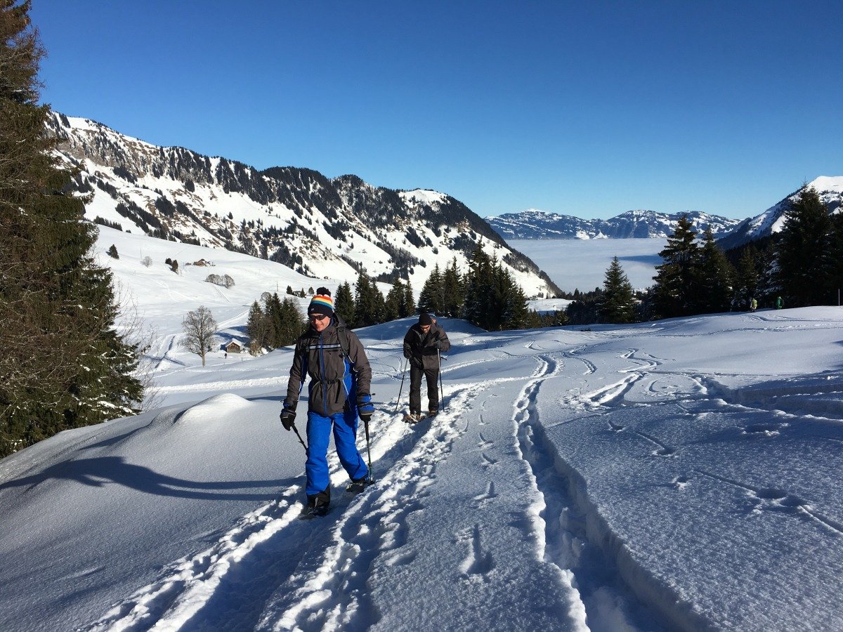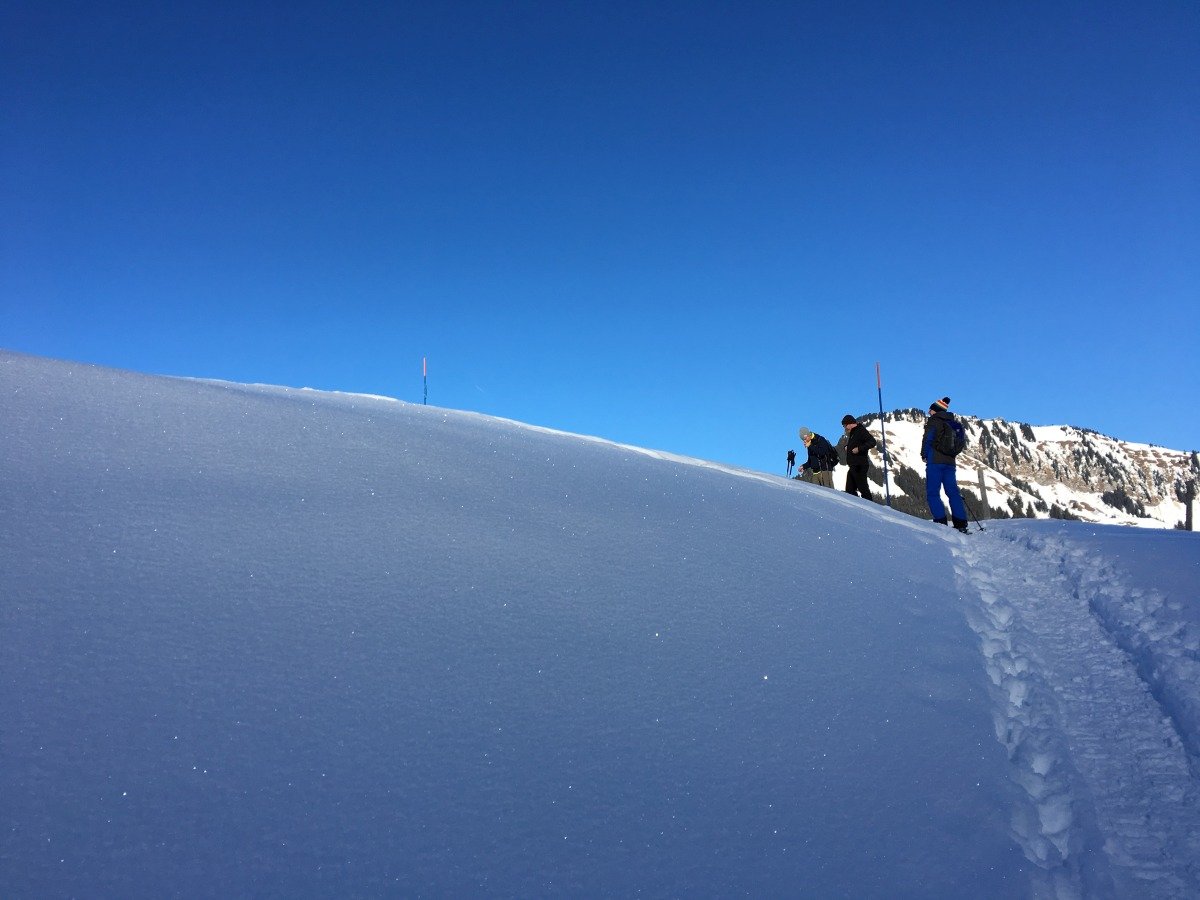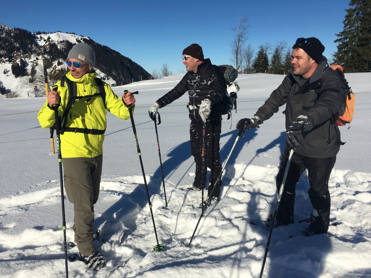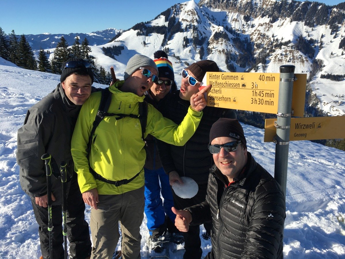 Auf der Gummenalp geniessen wir die tolle Sonnenterrasse bei Essen und Trinken. Am Nachmittag laufen wir weiter über den Vordergummen und den Wirzweligrat bis zum Horn. Der Abstieg durch den tiefen Schnee nach Wirzweli hinunter ist eine grosse Gaudi mit den Schneeschuhen. Im Tal angekommen lassen wir die Tour im gemütlichen Restaurant Arviblick bei ein paar Bier ausklingen.