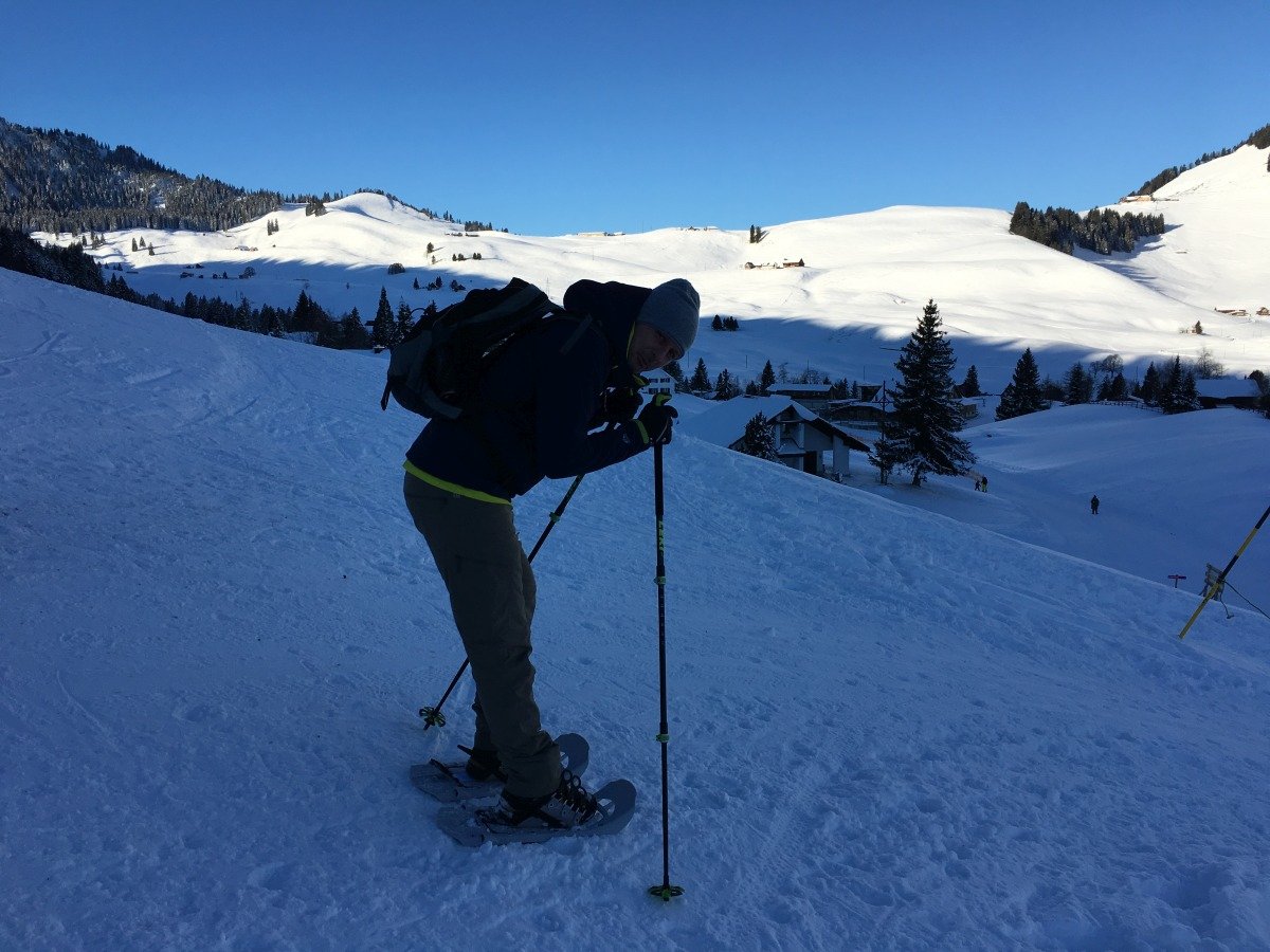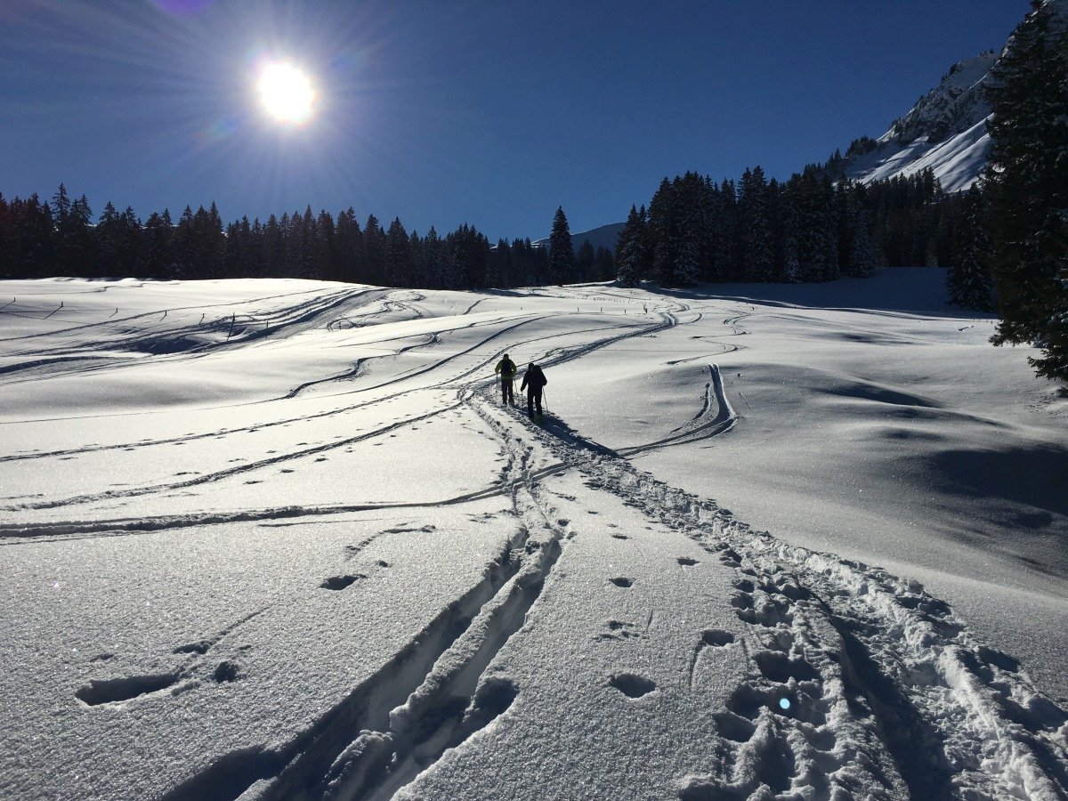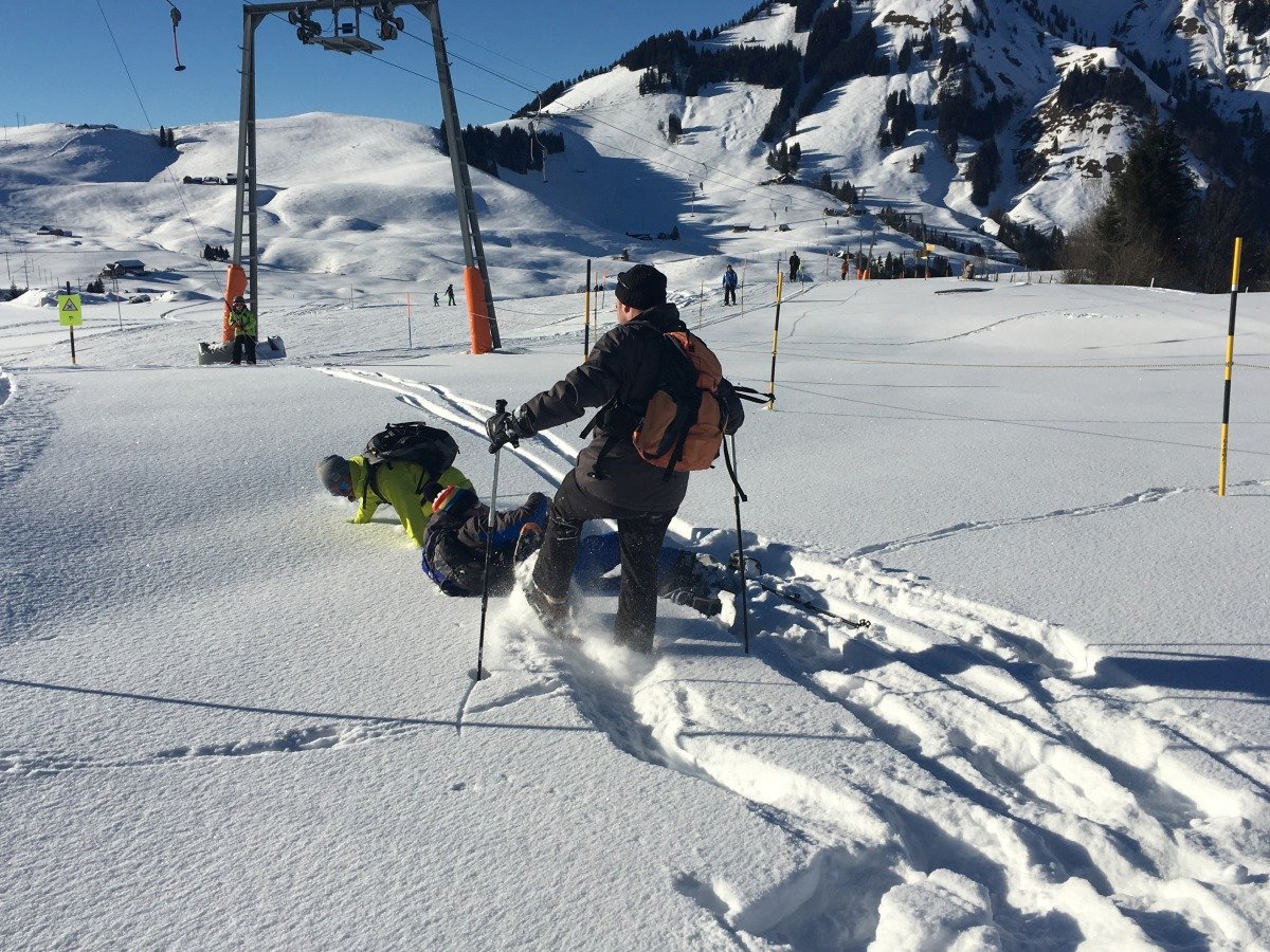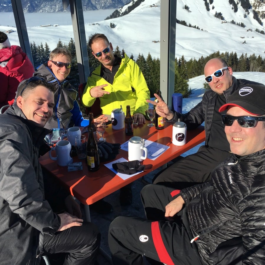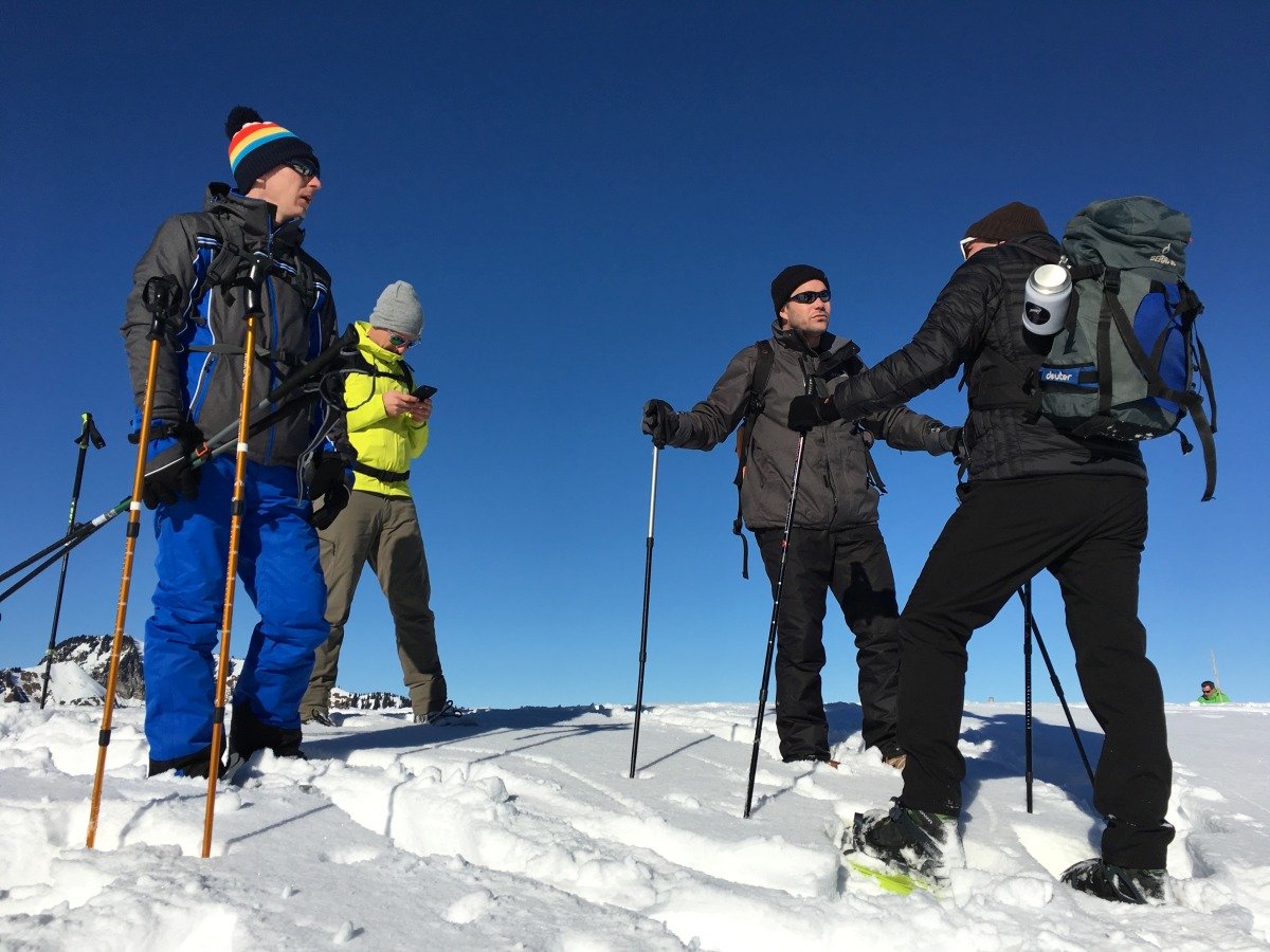 Auf der Gummenalp geniessen wir die tolle Sonnenterrasse bei Essen und Trinken. Am Nachmittag laufen wir weiter über den Vordergummen und den Wirzweligrat bis zum Horn. Der Abstieg durch den tiefen Schnee nach Wirzweli hinunter ist eine grosse Gaudi mit den Schneeschuhen. Im Tal angekommen lassen wir die Tour im gemütlichen Restaurant Arviblick bei ein paar Bier ausklingen.