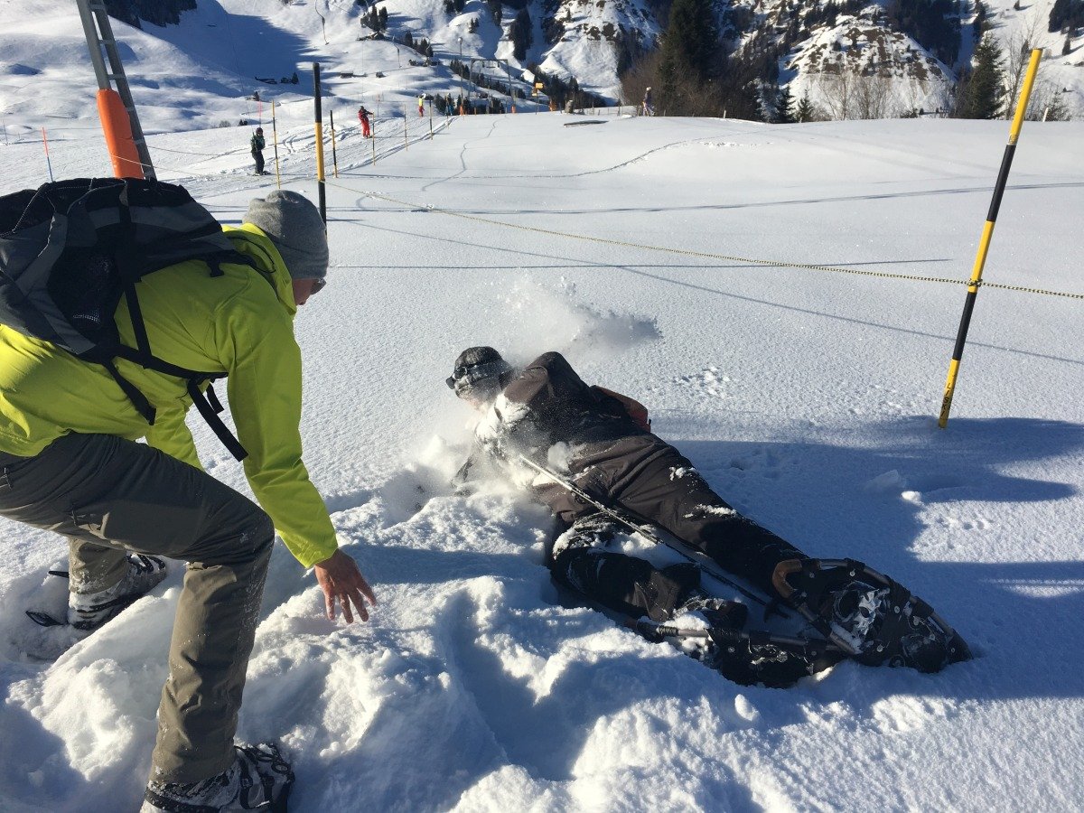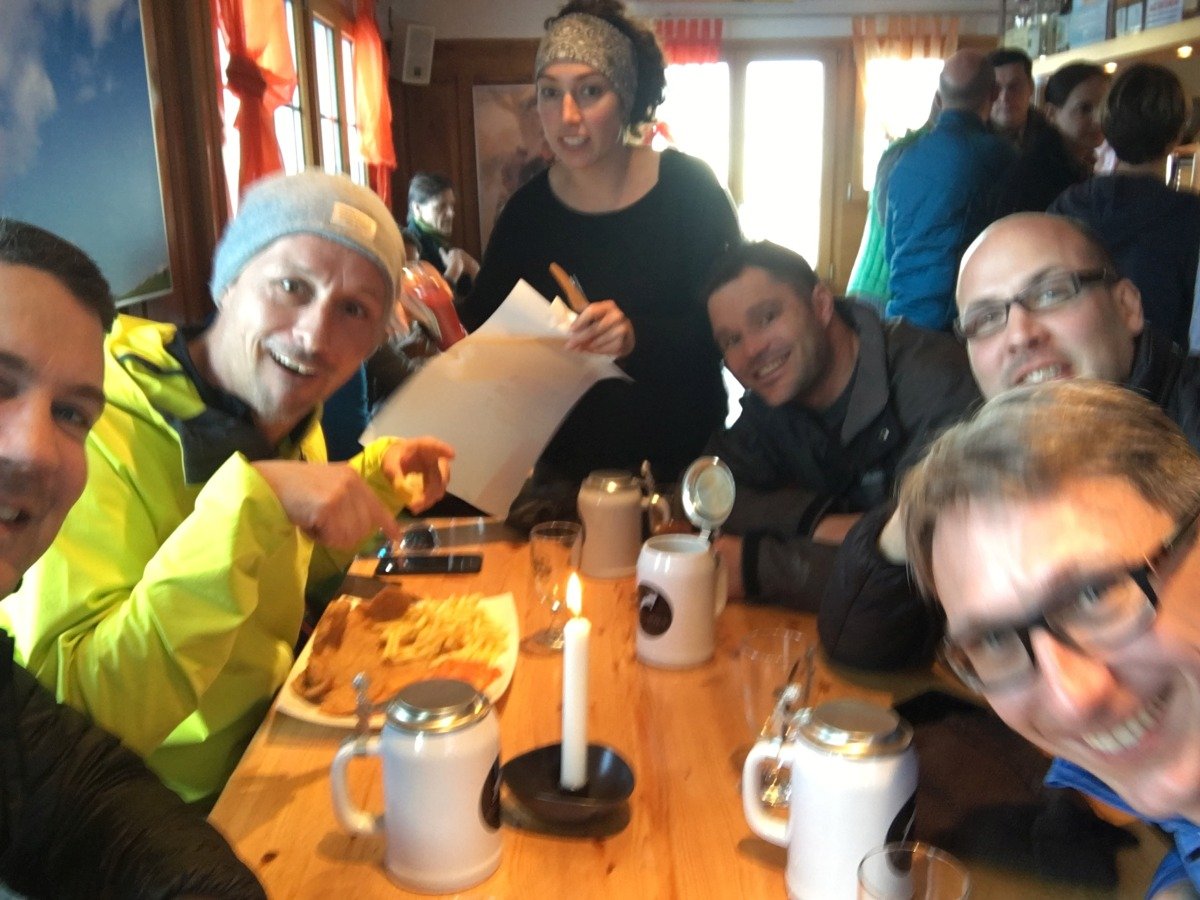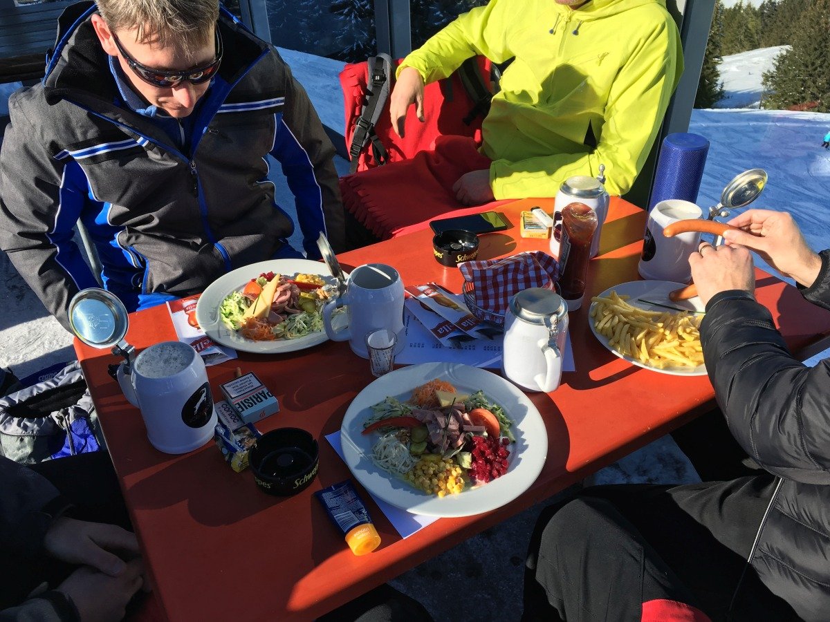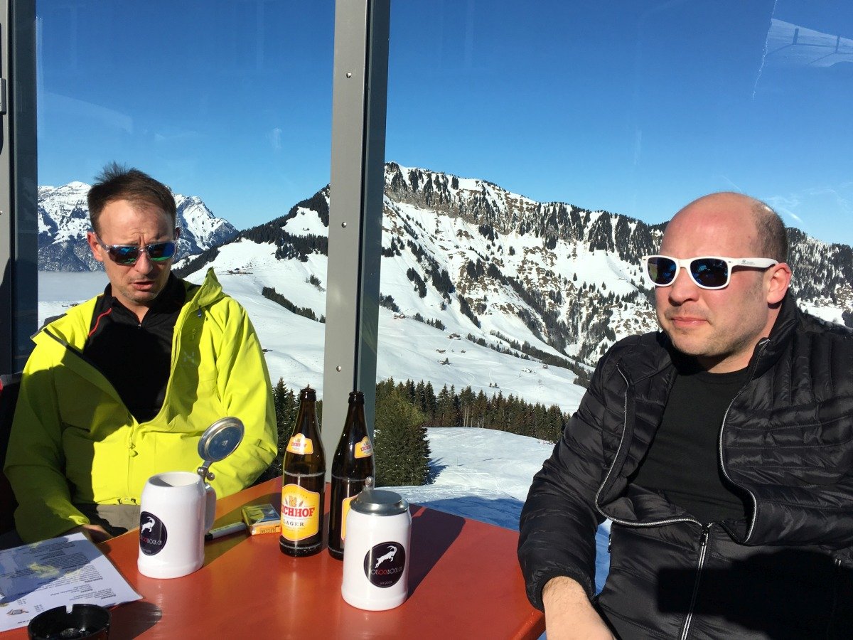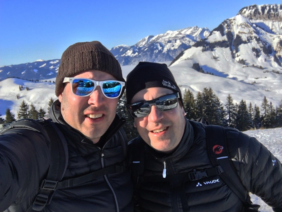 Auf der Gummenalp geniessen wir die tolle Sonnenterrasse bei Essen und Trinken. Am Nachmittag laufen wir weiter über den Vordergummen und den Wirzweligrat bis zum Horn. Der Abstieg durch den tiefen Schnee nach Wirzweli hinunter ist eine grosse Gaudi mit den Schneeschuhen. Im Tal angekommen lassen wir die Tour im gemütlichen Restaurant Arviblick bei ein paar Bier ausklingen.