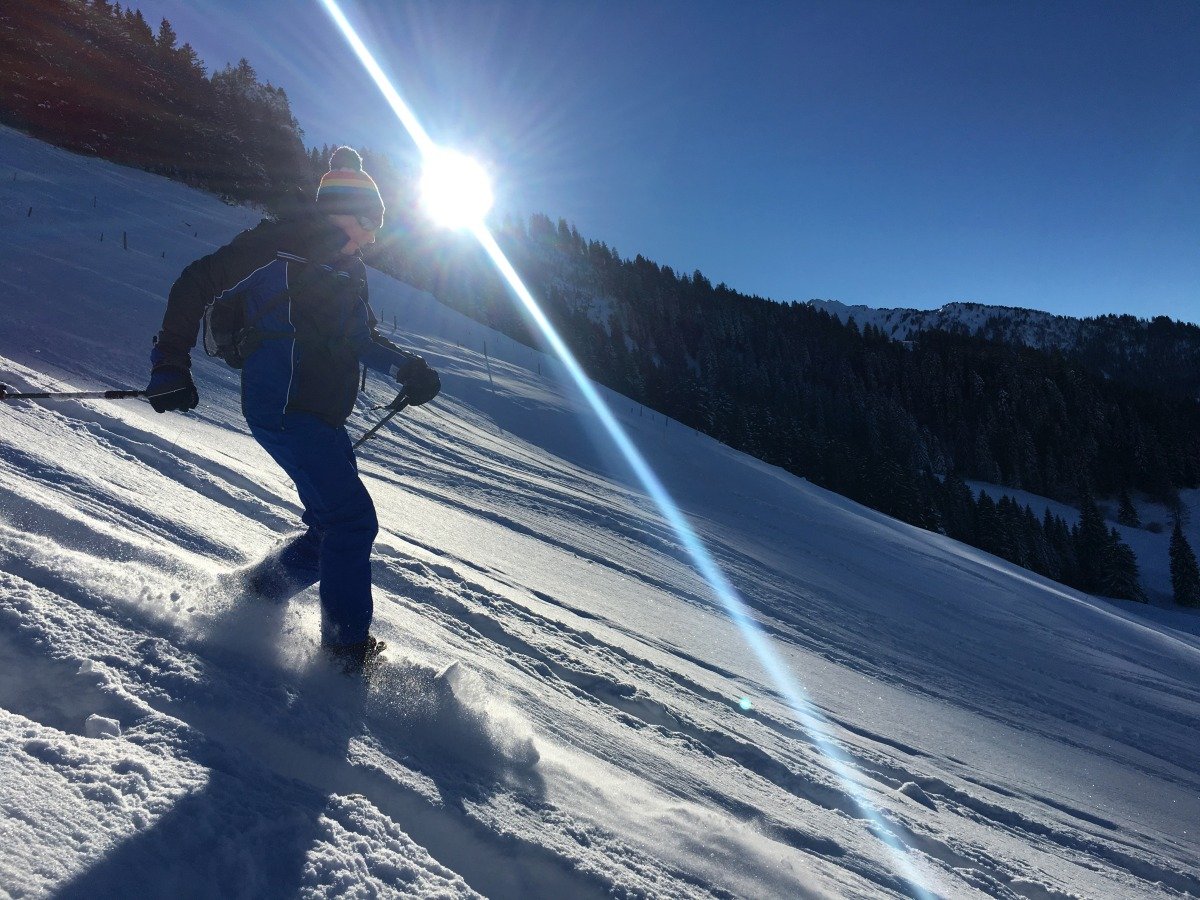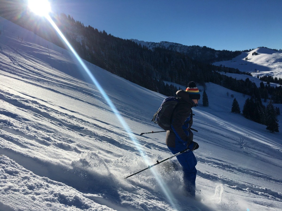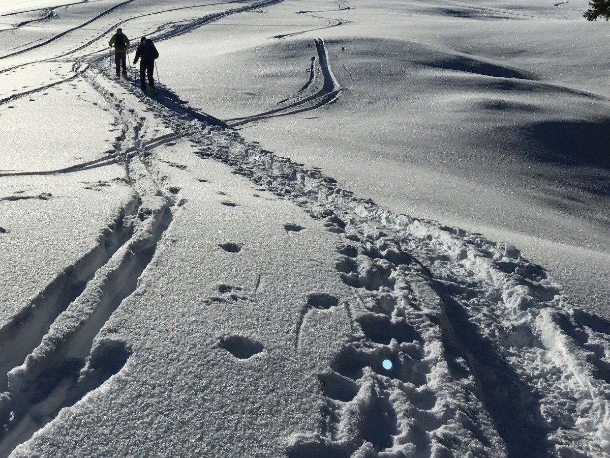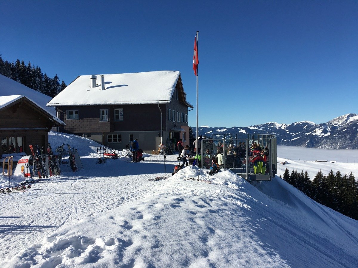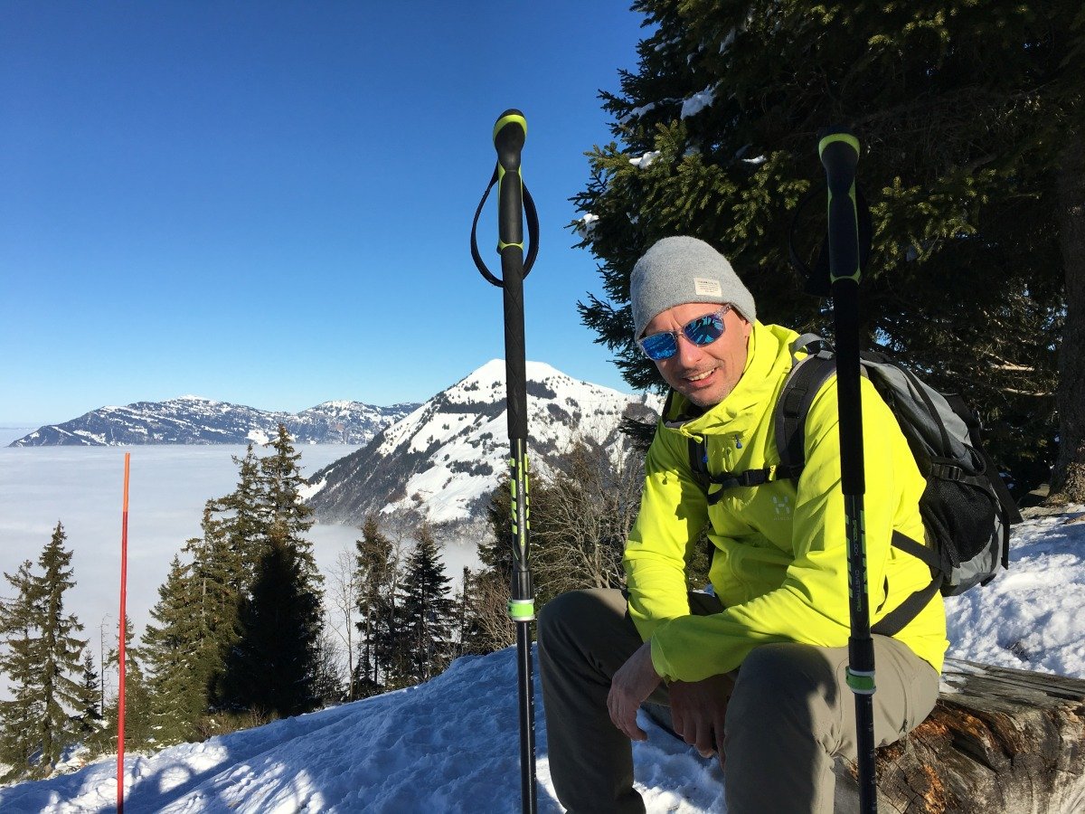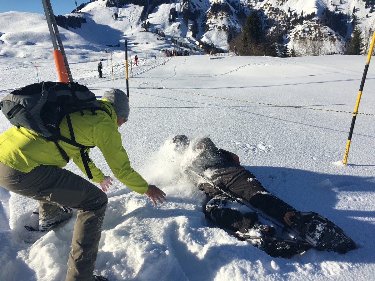 Auf der Gummenalp geniessen wir die tolle Sonnenterrasse bei Essen und Trinken. Am Nachmittag laufen wir weiter über den Vordergummen und den Wirzweligrat bis zum Horn. Der Abstieg durch den tiefen Schnee nach Wirzweli hinunter ist eine grosse Gaudi mit den Schneeschuhen. Im Tal angekommen lassen wir die Tour im gemütlichen Restaurant Arviblick bei ein paar Bier ausklingen.