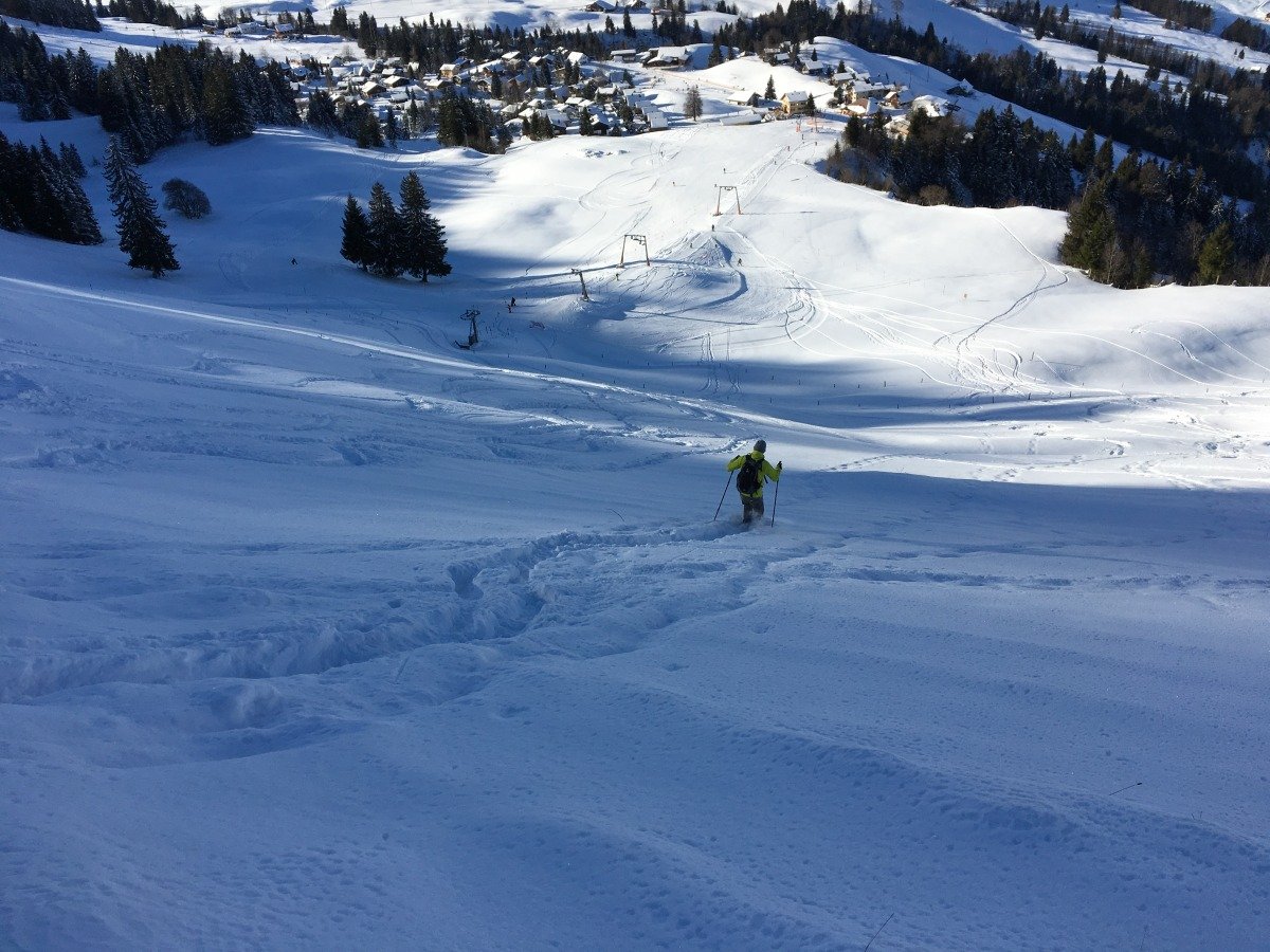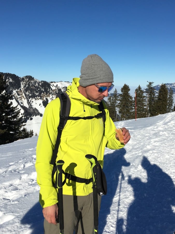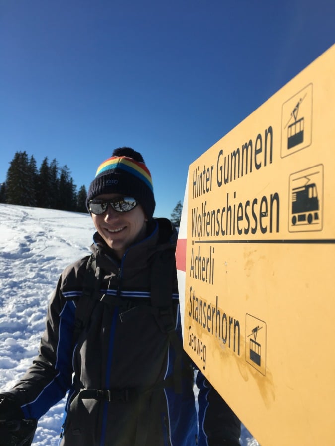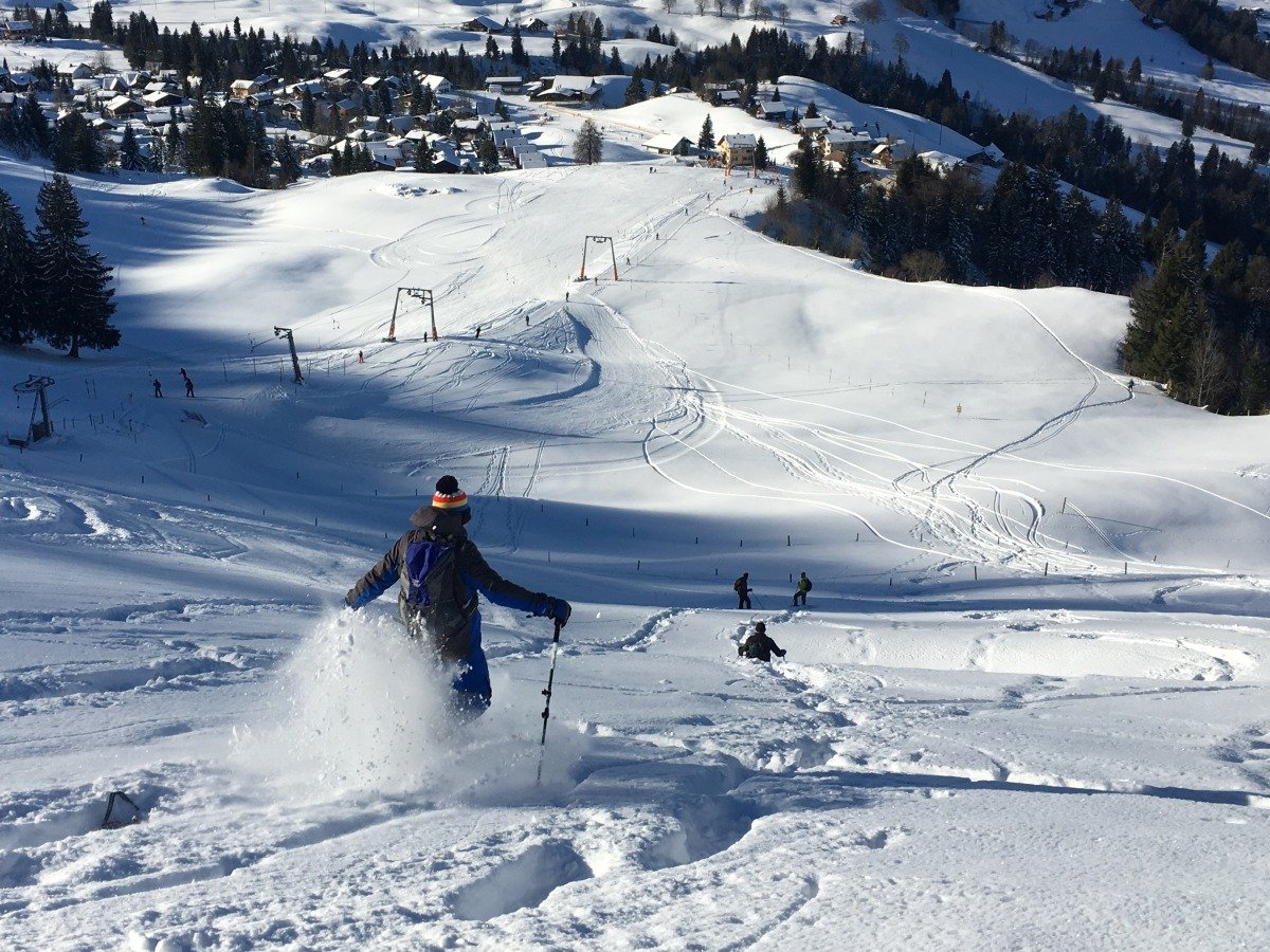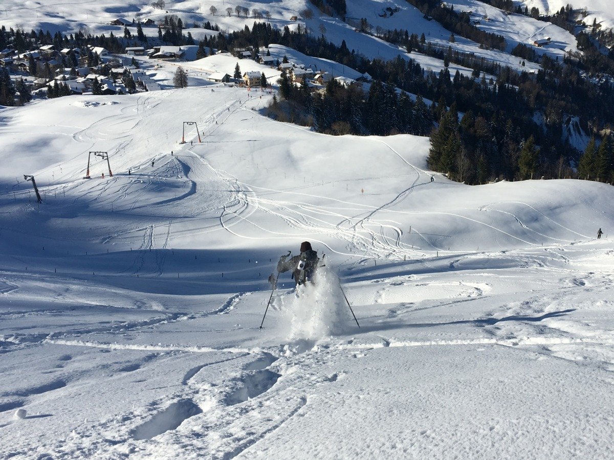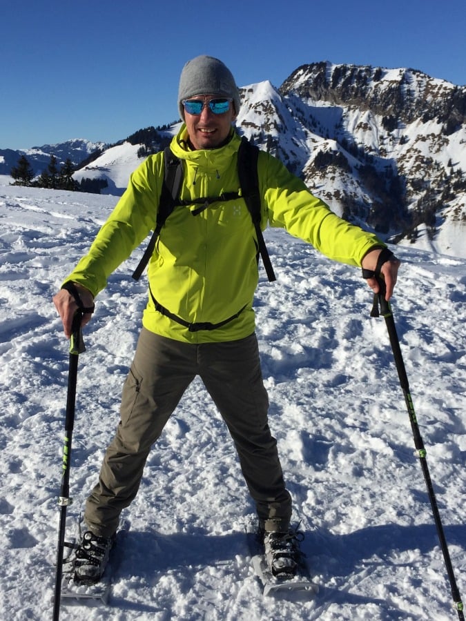Auf der Gummenalp geniessen wir die tolle Sonnenterrasse bei Essen und Trinken. Am Nachmittag laufen wir weiter über den Vordergummen und den Wirzweligrat bis zum Horn. Der Abstieg durch den tiefen Schnee nach Wirzweli hinunter ist eine grosse Gaudi mit den Schneeschuhen. Im Tal angekommen lassen wir die Tour im gemütlichen Restaurant Arviblick bei ein paar Bier ausklingen.