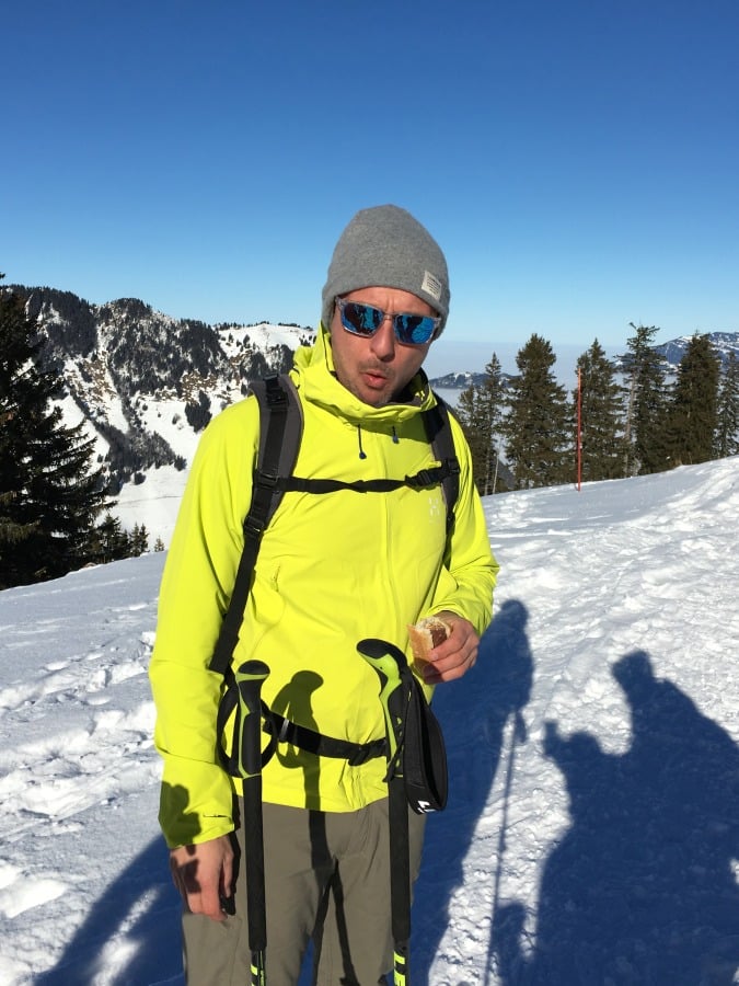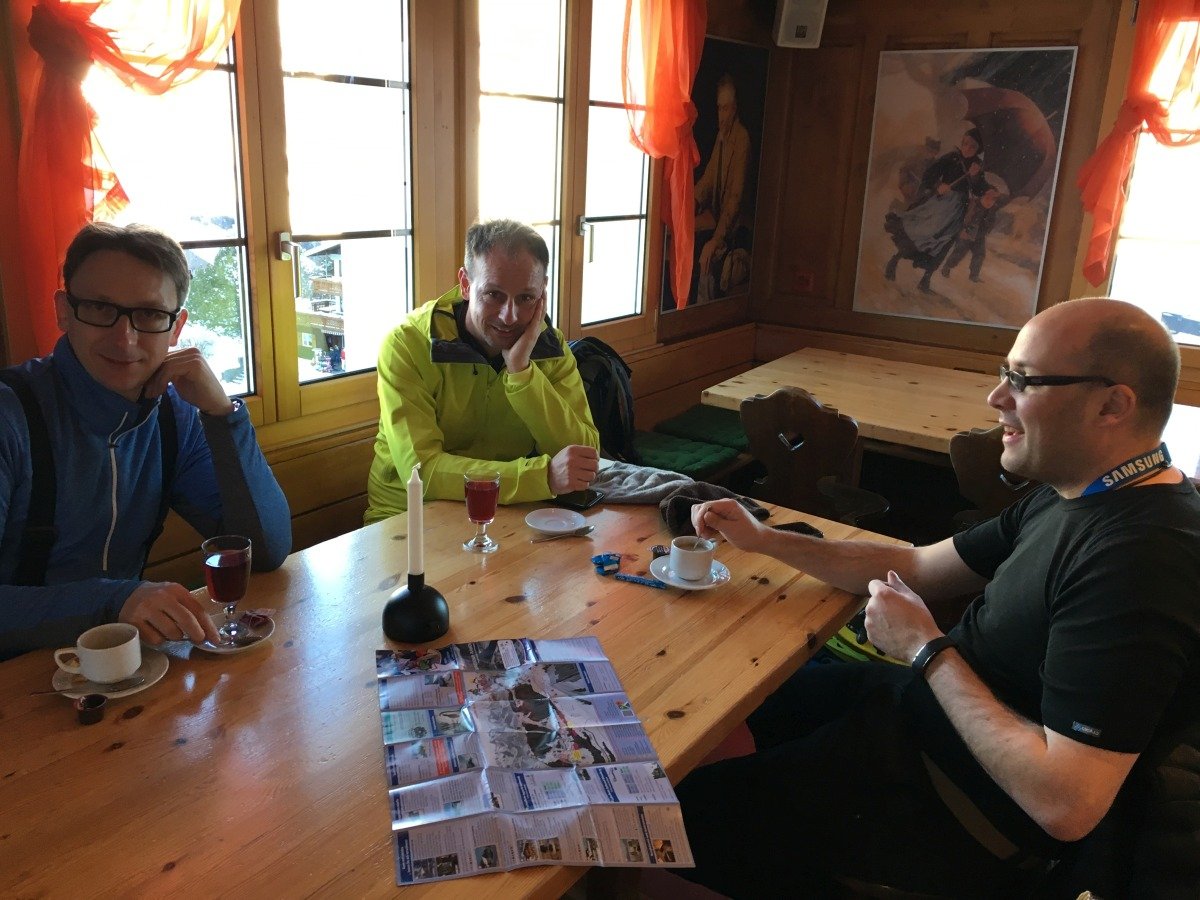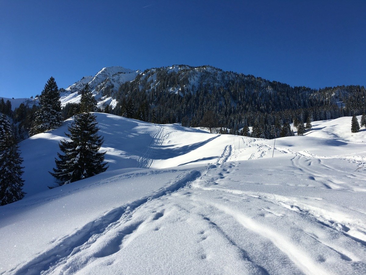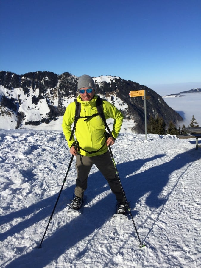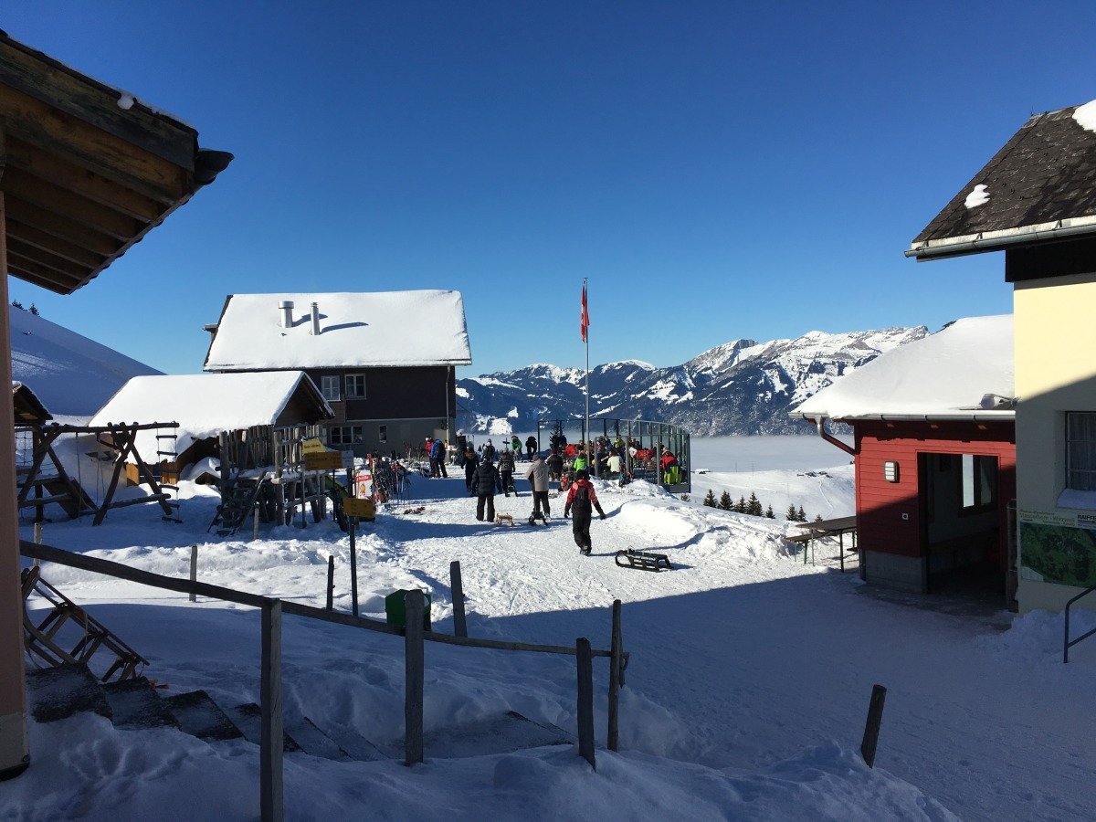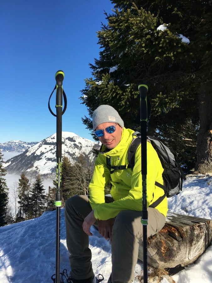 Auf der Gummenalp geniessen wir die tolle Sonnenterrasse bei Essen und Trinken. Am Nachmittag laufen wir weiter über den Vordergummen und den Wirzweligrat bis zum Horn. Der Abstieg durch den tiefen Schnee nach Wirzweli hinunter ist eine grosse Gaudi mit den Schneeschuhen. Im Tal angekommen lassen wir die Tour im gemütlichen Restaurant Arviblick bei ein paar Bier ausklingen.