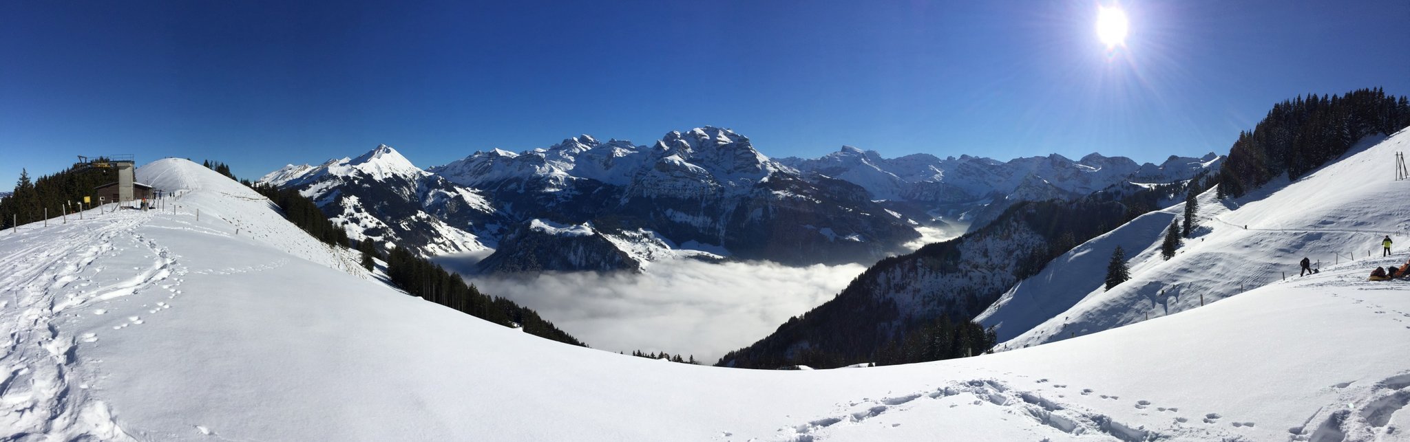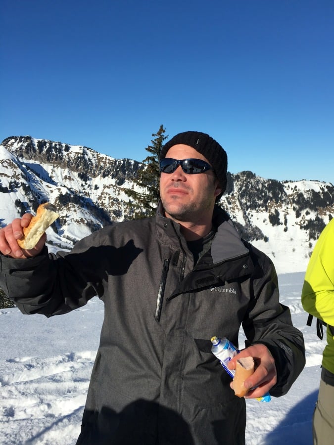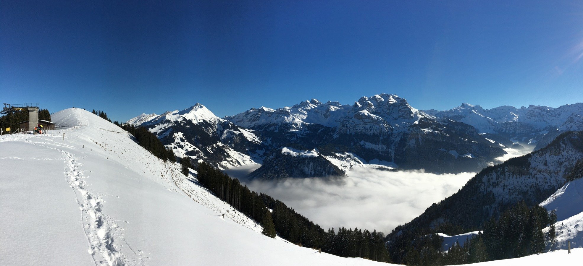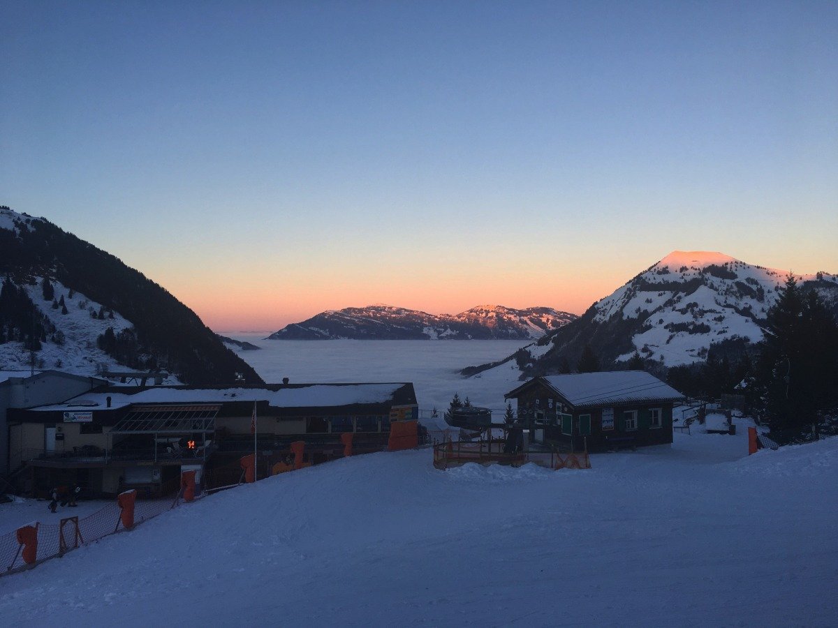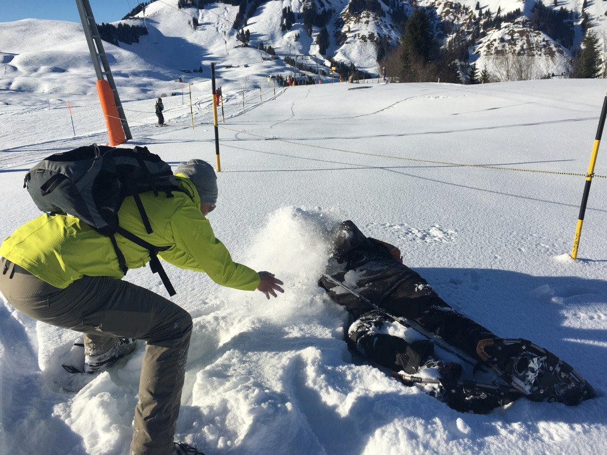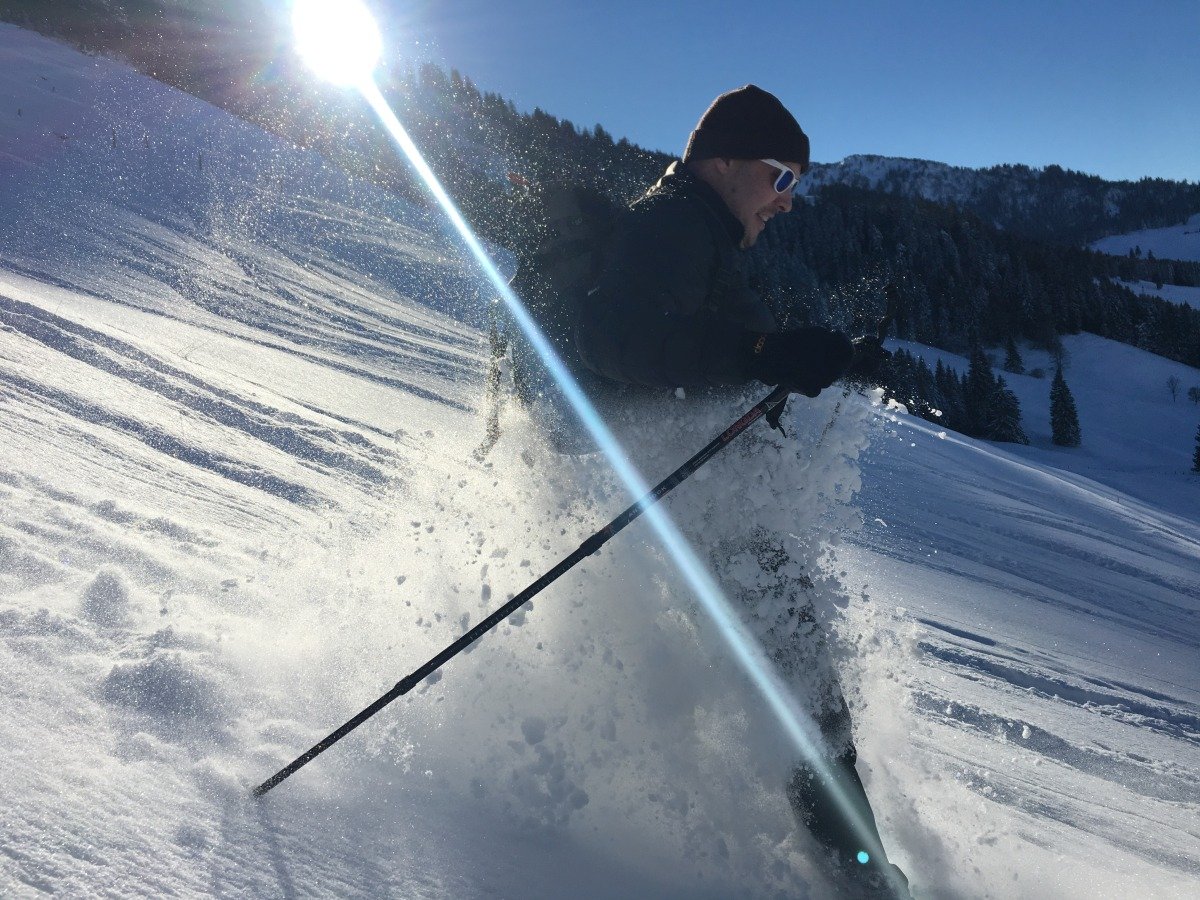 Auf der Gummenalp geniessen wir die tolle Sonnenterrasse bei Essen und Trinken. Am Nachmittag laufen wir weiter über den Vordergummen und den Wirzweligrat bis zum Horn. Der Abstieg durch den tiefen Schnee nach Wirzweli hinunter ist eine grosse Gaudi mit den Schneeschuhen. Im Tal angekommen lassen wir die Tour im gemütlichen Restaurant Arviblick bei ein paar Bier ausklingen.