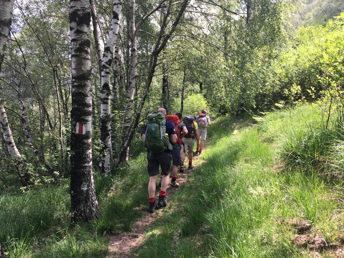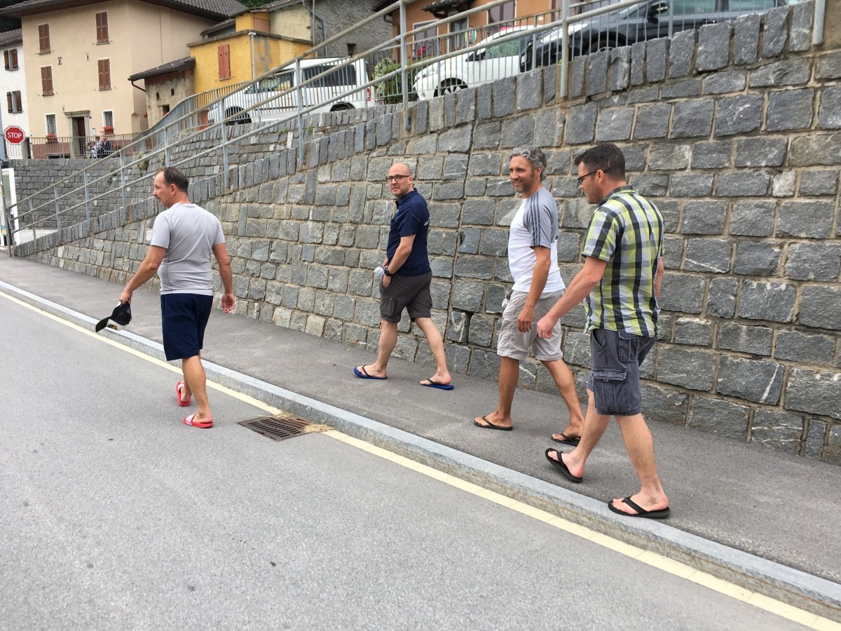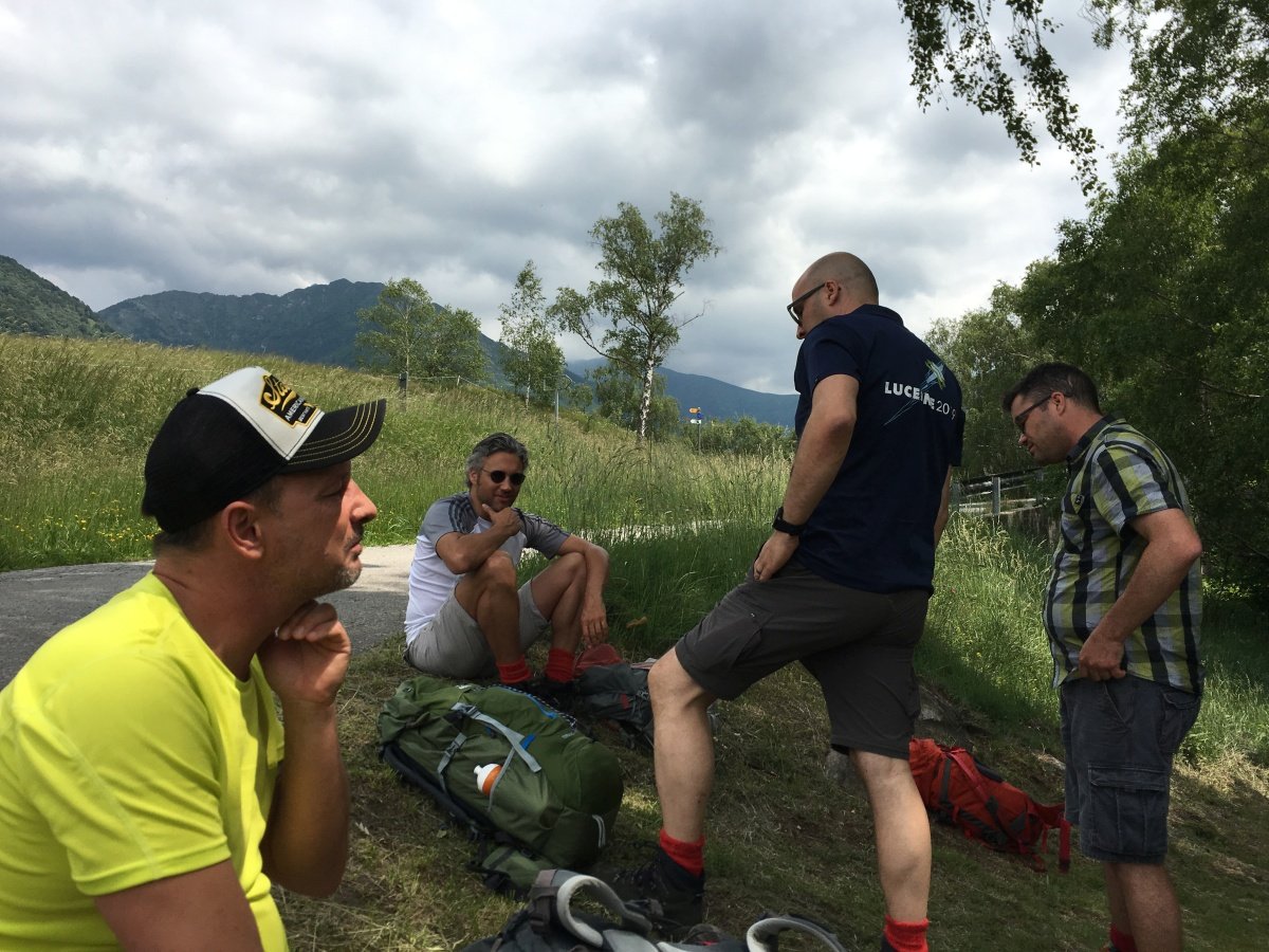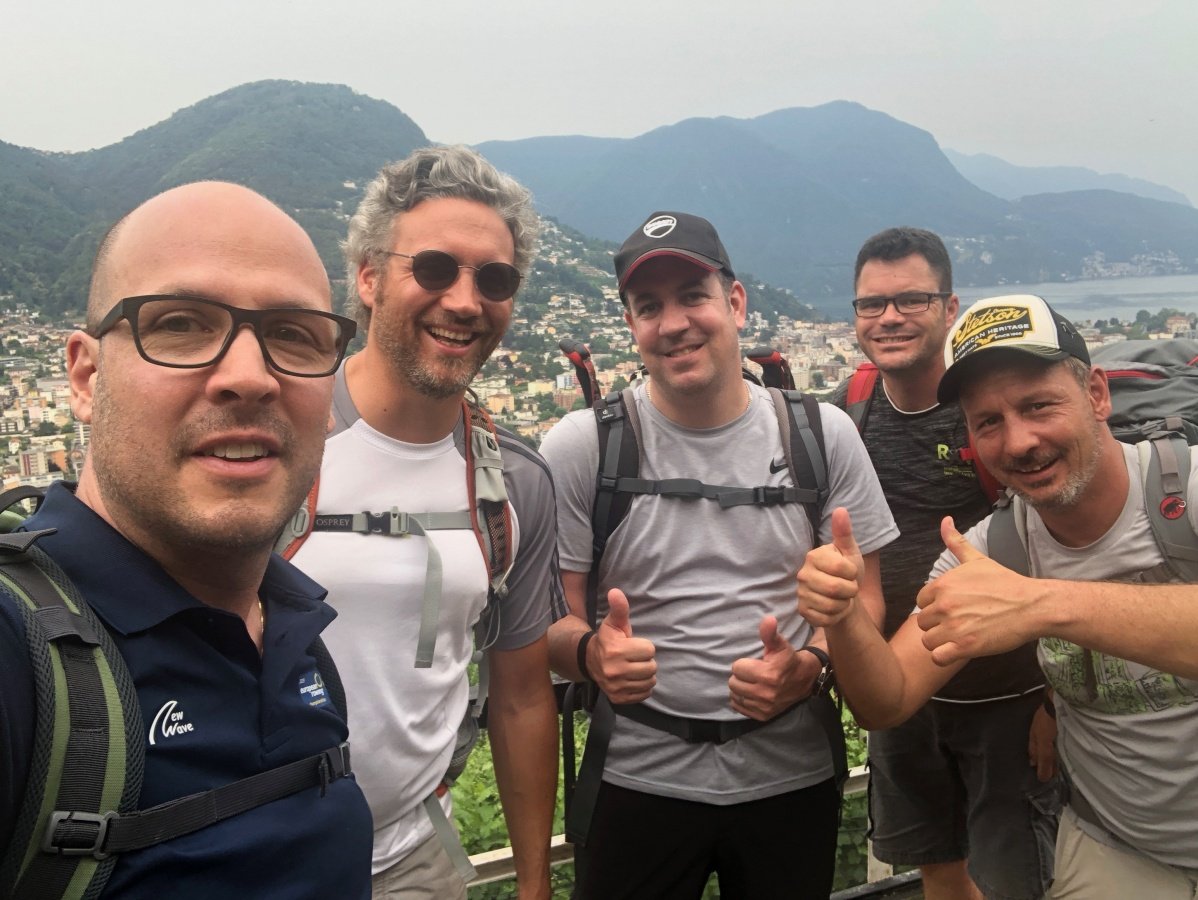 Kaum zu glauben, fast auf den Tag 10 Jahre ist es her. Unsere erste Tour 2009 auf die Fräkmüntegg. Heute starten wir unsere Jubiläumstour, welche uns von Cadenazzo über viele Hügel und Berge bis nach Mendrisio führen wird. Der Start in Cadenazzo ist gleich ziemlich heftig. Nach kurzem Einlaufen erklimmen wir den Cima di Dentro bei brütender und schwüler Hitze. Wie frisch geduscht kommen wir oben an und machen eine kurze Mittagspause. Danach gehts noch eine Stunde bergab bis zu unserer ersten Unterkunft in Isone. Früh sind wir dort und durstig sind wir auch. Der Abend wird lustig und spät. Was wir natürlich am nächsten Tag beim Anstieg zum Gola di Lago sofort bereuen. Doch die wunderschöne Ebene mit Sümpfen, Farnen und vielen Birken lässt uns den Kater wieder vergessen. Nach einer kurzen Rast in der Alpe Sta Maria di Lago wandern wir auf tollem Weg zum Aussichtspunkt auf dem Monte di Bigorio, mit 1160müM den höchsten Punkt unserer Tour. Das Panorama ist fantastisch und wir sehen die ganze Route der nächsten Tage direkt vor uns liegen. Beim langen und anstrengenden Abstieg hinunter nach Tesserete werden wir kurz nach dem Kloster Convento Sta Maria von einem netten Weinbauern spontan auf ein Gläschen seiner neusten Weinschöpfung eingeladen. Nach ein bisschen Weinkunde und ausgiebigem Probieren gehts erstaunlich locker weiter Richtung Lugano - Savosa. Kurz vor Savosa übersteigen wir noch den Hügel San Bernardo. Dabei gibt uns die grosse Hitze den Rest und wir sind alle froh, als wir in Savosa in der Jugendherberge eintreffen. Nach einem erfrischenden Bad im Pool gehts ins nahe gelegene Ristorante Pizzeria La Ticinella, wo wir hervorragend bewirtet werden. Absolut zu empfehlen.