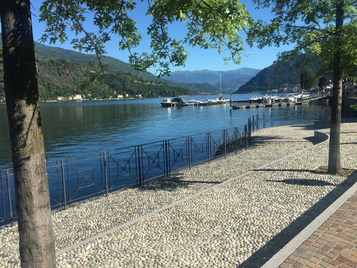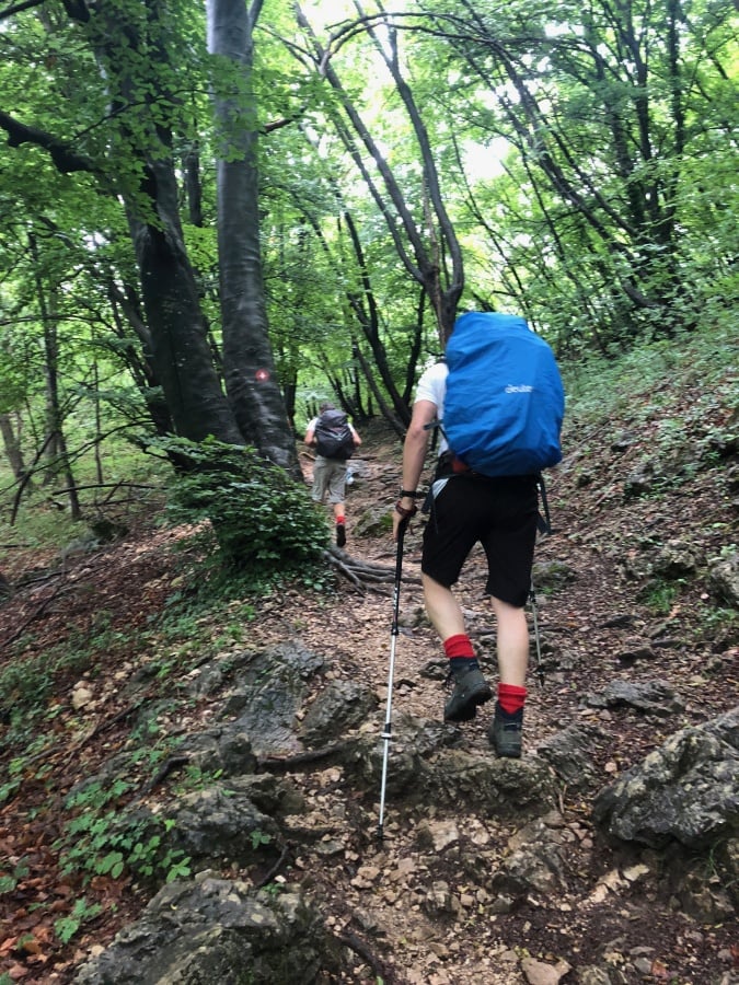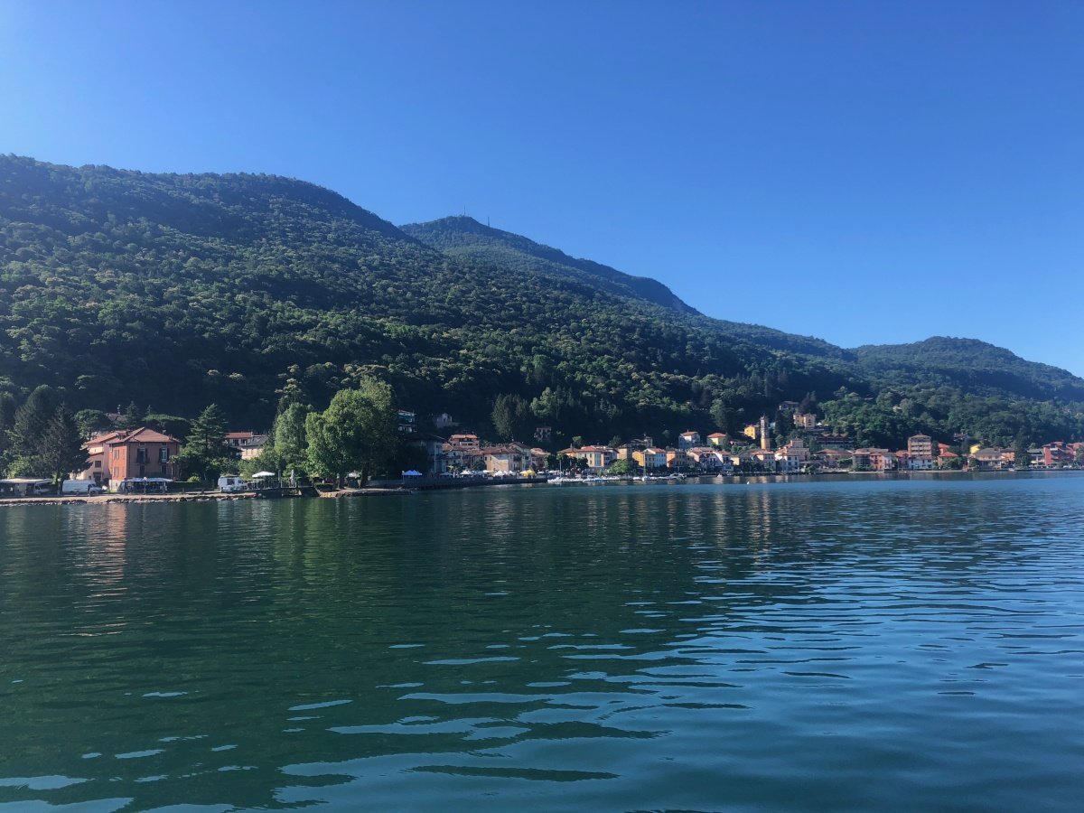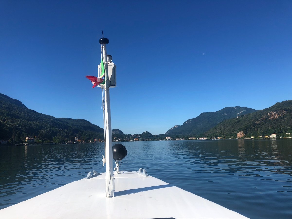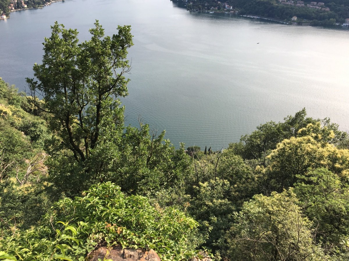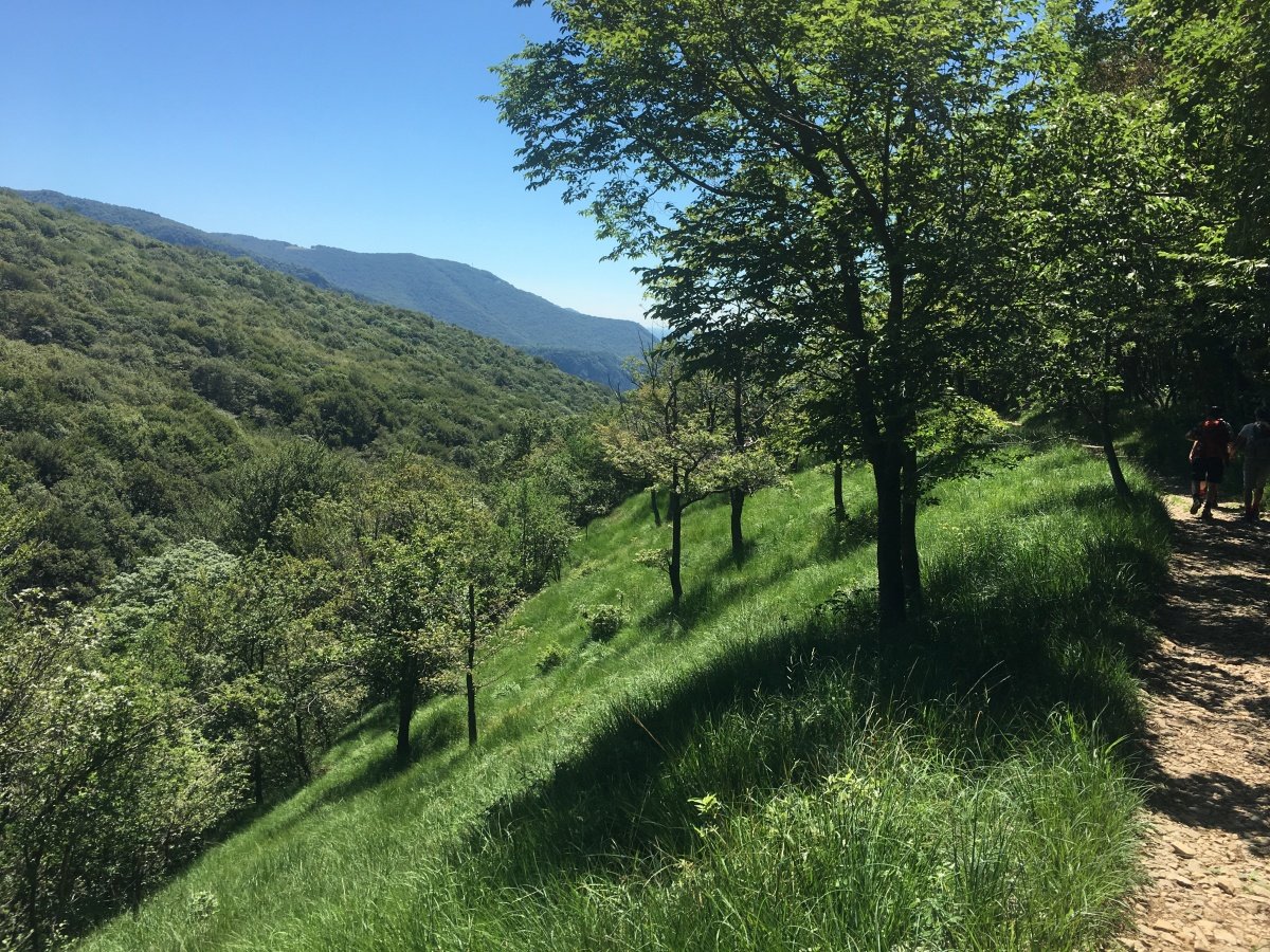 Am nächsten Morgen begrüsst uns allerbestes Sommerwetter wie aus dem Bilderbuch. Da das Schiff nach Brusino am Sonntag nicht regelmässig fährt, müssen wir umdisponieren und wir beschliessen, unseren 4. Wandertag in Porto Ceresio in Italien zu starten. Nach einer kurzen, eindrücklichen Fahrt auf dem Lago di Lugano treffen wir in Porto Ceresio ein. Vom Seeufer steigen wir über den Monte Casolo hinauf bis zum Grenzpunkt 54. Von dort wandern wir weiter über Crocefisso hinauf zum Monte San Giorgio. Kurz vor dem Gipfel müssen wir leider aus Zeitgründen vorzeitig abbiegen Richtung Cassina - Meride, so dass wir in Mendrisio unseren Zug pünktlich erreichen können. Schade um den schönen Ausblick, aber die Entscheidung war richtig, denn der Abstieg vom Monte San Giorgio bis nach Mendrisio ist lang und anstrengend. So treffen wir eine halbe Stunde vor der Abfahrt unseres Zuges am Bahnhof ein.
