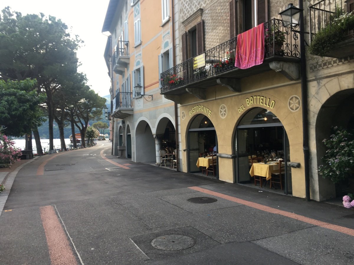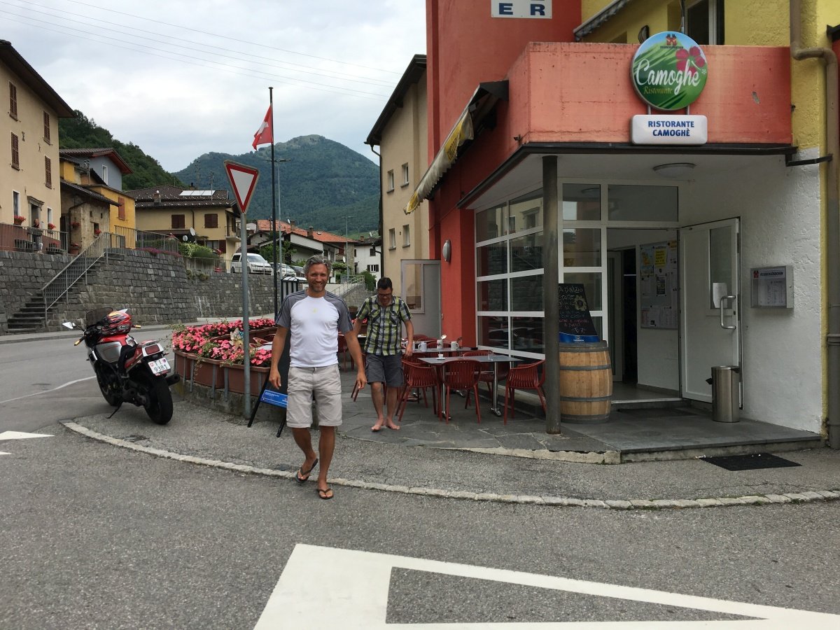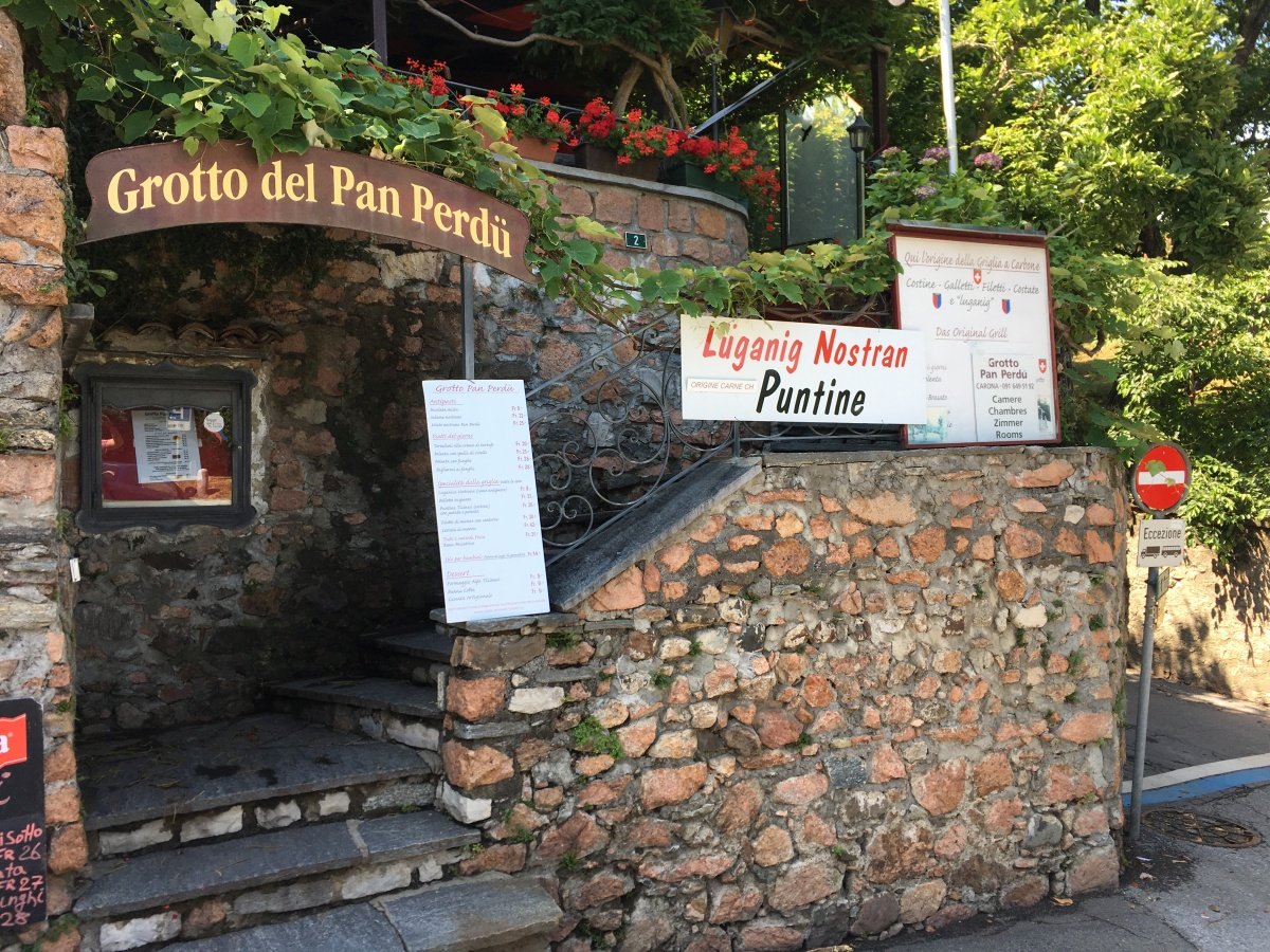 Kaum oben angekommen reisst der Himmel auf und die Sonne scheint wieder vom blauen Himmel. So gehts hinunter zum wunderschönen Örtchen Ciona, wo wir ausgiebig fotografieren und das Tessiner Ambiente geniessen. Und endlich finden wir kurz darauf auch ein typisches Grotto für ein Glas Weisswein. Nach dem Rast im hübschen Grotto del Pan Perdü wandern wir weiter zur Alpe Vicania welche uns richtig umhaut. Eine solch gepflegte Alpbeiz mit 14 Gault Millau Punkten findet man wohl nicht so schnell wieder. Wir lassen es uns nicht nehmen und bestellen eine edle Flasche Weisswein Castello die Morcote, welcher uns hervorragend schmeckt. Dazu werden wir mit frisch geschnittenem Schinken und allerlei Häppchen bewirtet. Auch dieser Ort ist absolut eine anstrengende Wanderung wert. Ein bisschen fahrig vom Wein laufen wir den steilen Weg über Vico Morcote bis nach Morcote hinunter und landen direkt vor unserem Hotel - Ristorante del battello. Nach einem höchstens mittelmässigen Abendessen im Hotel lassen wir den langen Tag bei einem Bierchen ausklingen.