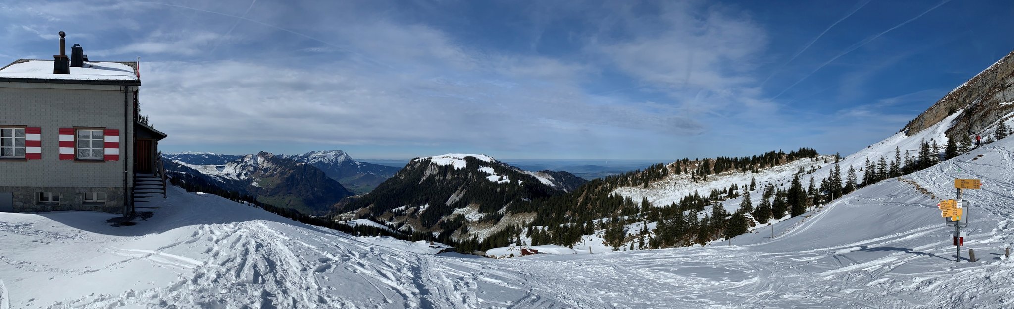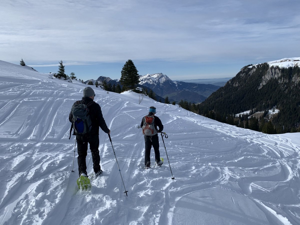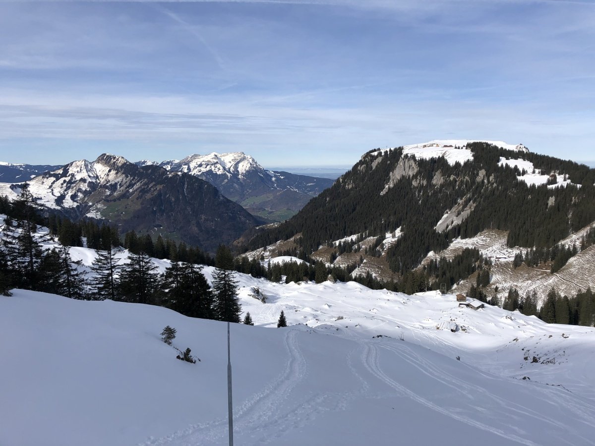 Der Winter 2020 macht es nicht gerade einfach für die Tourenplanung. Im Tal ist der Winter gar nie angekommen und unterhalb von 1400 müM ist Schnee ein rares Gut. Darum entschliessen wir uns für die Allround-Variante einer Schneeschuh-Tour. Das Wetter ist frühlingshaft mild und zeigt sich von seiner besten Seite. Wir fahren mit der Seilbahn von Niederrickenbach Station hinauf nach Niederrickenbach und starten im Grünen mit den Wanderschuhen Richtung Ahornalp. Nach der Ahornalp nimmt der Schnee dann langsam zu und im Gebiet Brändlisboden auf 1450müM ziehen wir dann definitiv die Schneeschuhe an. Der anfänglich gemächliche Wanderweg wird nun steiler und wir überwinden relativ schnell die 600 Höhenmeter bis zum Brisenhaus SAC.