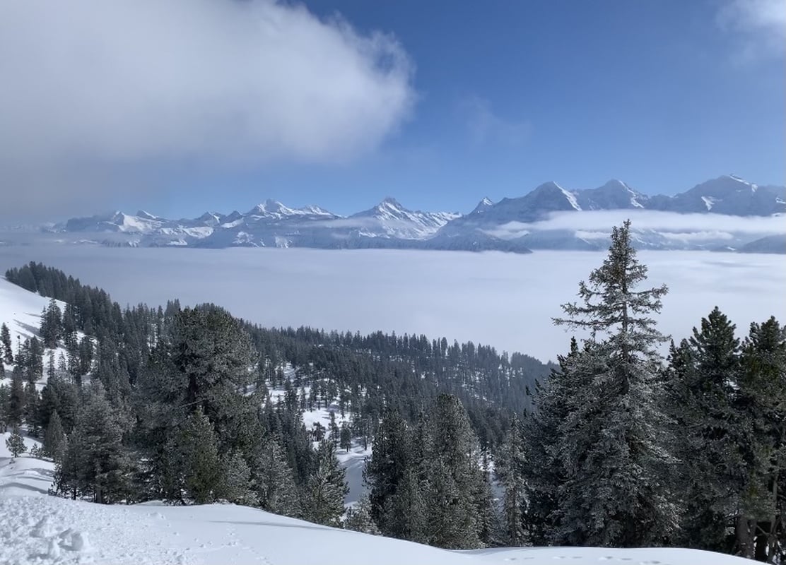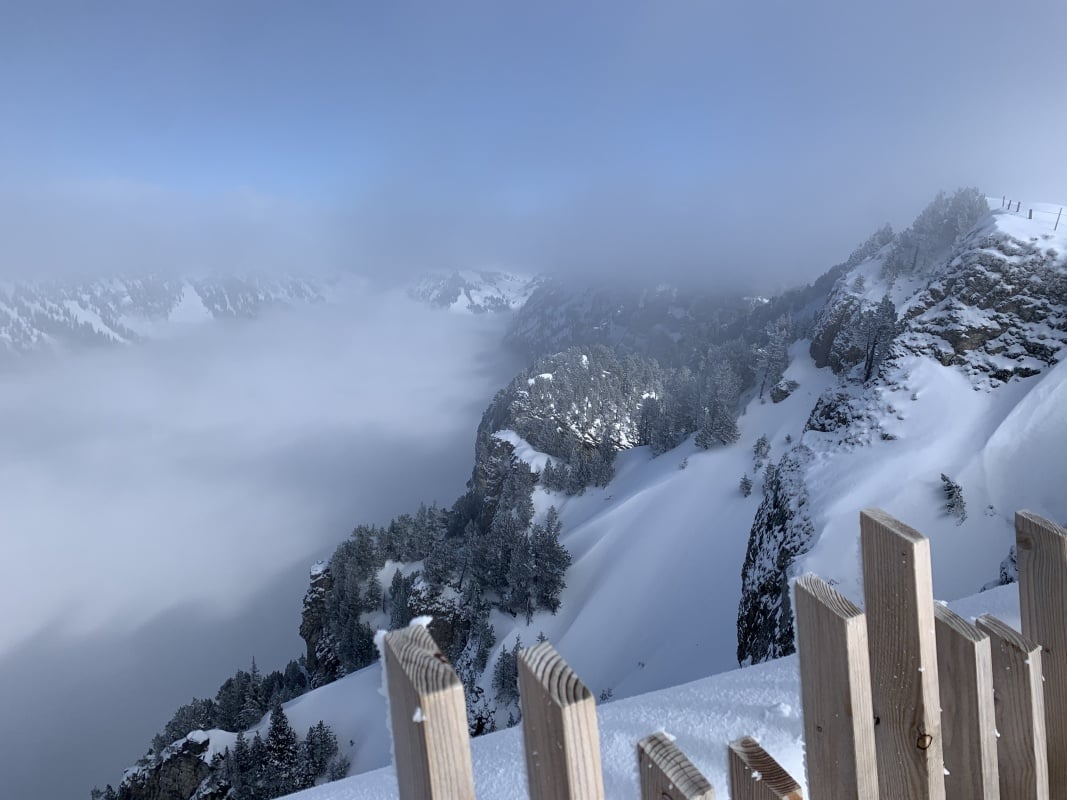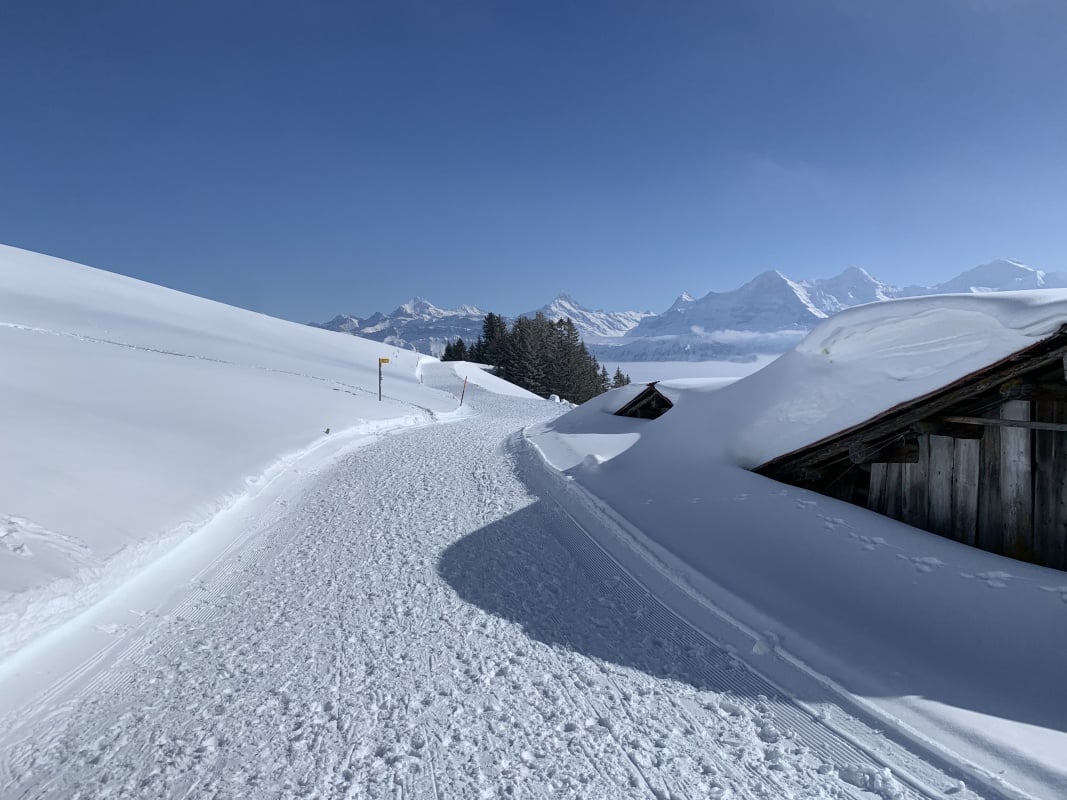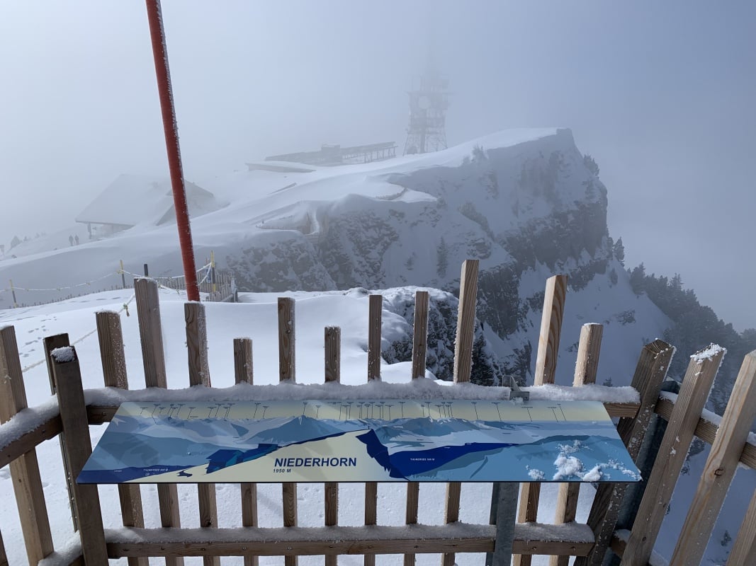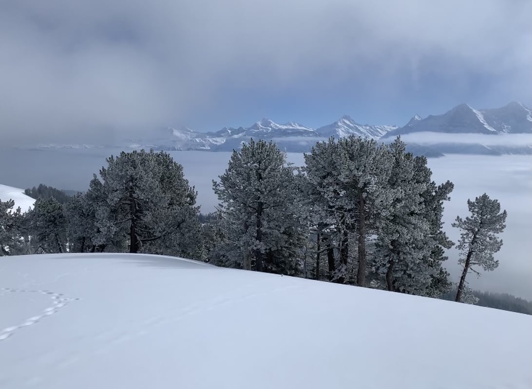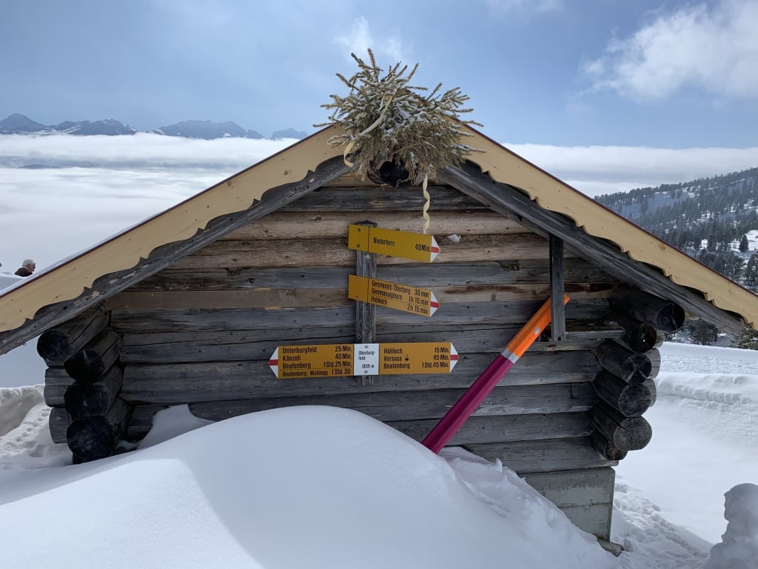 Der Winter schlägt richtig zu und es ist bitter kalt an diesem nebligen Morgen. Doch gegen Mittag soll gemäss Meteo die Sonne kommen und danach richten wir uns zeitlich. So fahren wir erst um 11.00 Uhr bei dichtem Nebel mit der Seilbahn von Beatenberg auf das Niederhorn (1933 müM) hinauf. Wir beschliessen, auf die Sonne zu warten und vertreiben uns die Zeit in der Kälte mit einem warmen Kafi Zwätschge vom Take Away. Dabei lernen wir Ueli und Francoise kennen. Auch Sie warten auf die Sonne und es entstehen interessante Gespräche. Etwa um 12.30 Uhr ist es soweit und die Sonne durchdringt langsam den dichten Nebel. Dies ist für uns der Startschuss für unsere Winterwanderung Richtung Waldegg. Der breite Weg führt erst entlang dem Güggisgrat bis zum Weiler Oberburgfeld. Dort machen wir bei strahlendem Sonnenschein Mittagspause und bewundern das grossartige Panorama der hohen Berner Alpen. Kurz nach dem Oberburgfeld verlassen wir den