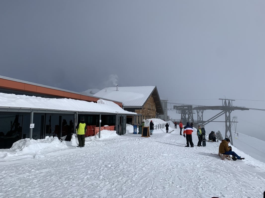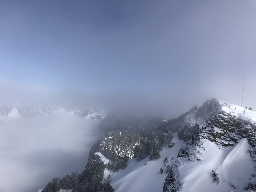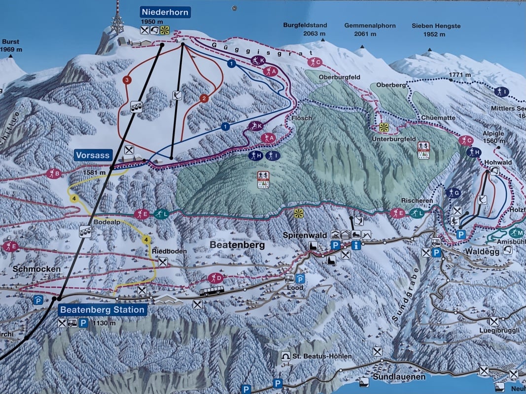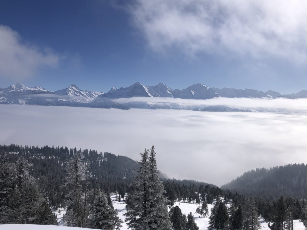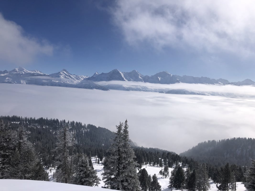 Der Winter schlägt richtig zu und es ist bitter kalt an diesem nebligen Morgen. Doch gegen Mittag soll gemäss Meteo die Sonne kommen und danach richten wir uns zeitlich. So fahren wir erst um 11.00 Uhr bei dichtem Nebel mit der Seilbahn von Beatenberg auf das Niederhorn (1933 müM) hinauf. Wir beschliessen, auf die Sonne zu warten und vertreiben uns die Zeit in der Kälte mit einem warmen Kafi Zwätschge vom Take Away. Dabei lernen wir Ueli und Francoise kennen. Auch Sie warten auf die Sonne und es entstehen interessante Gespräche. Etwa um 12.30 Uhr ist es soweit und die Sonne durchdringt langsam den dichten Nebel. Dies ist für uns der Startschuss für unsere Winterwanderung Richtung Waldegg. Der breite Weg führt erst entlang dem Güggisgrat bis zum Weiler Oberburgfeld. Dort machen wir bei strahlendem Sonnenschein Mittagspause und bewundern das grossartige Panorama der hohen Berner Alpen. Kurz nach dem Oberburgfeld verlassen wir den