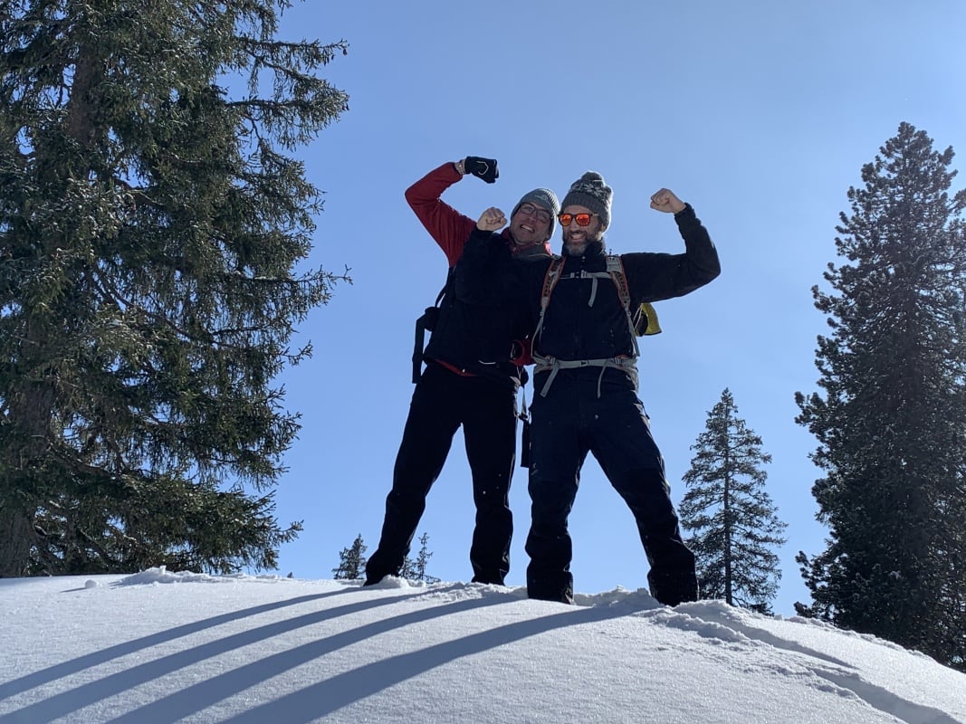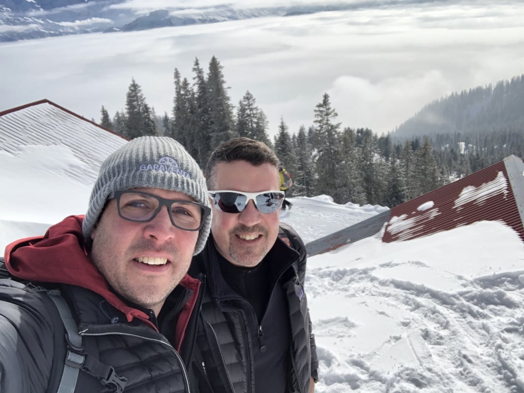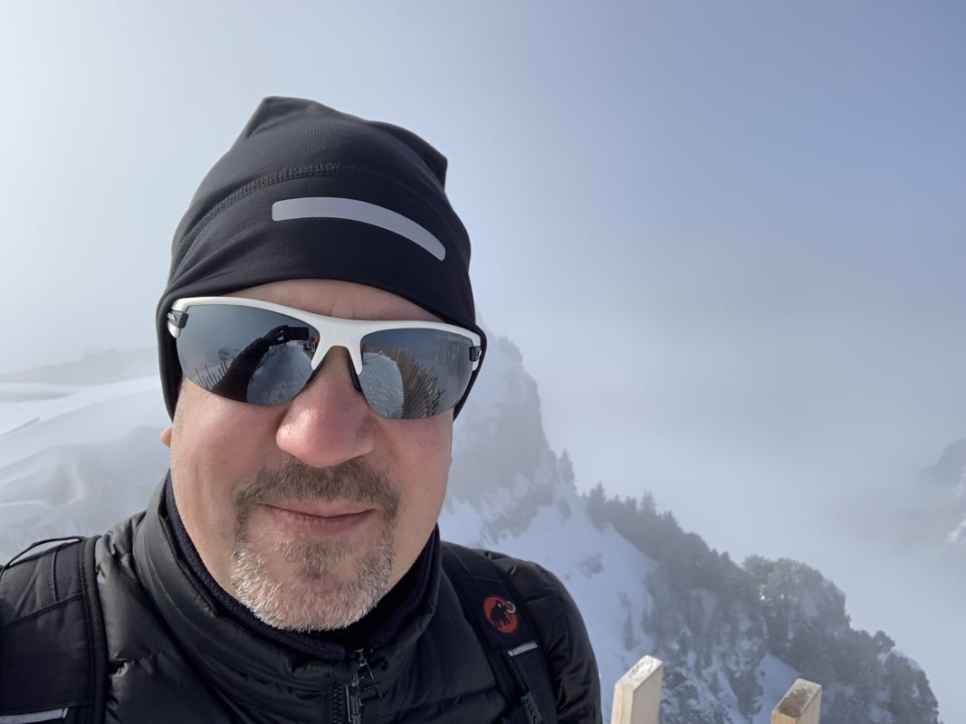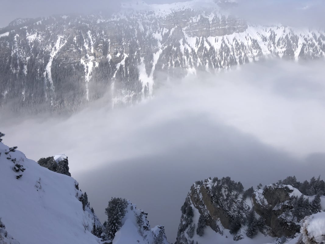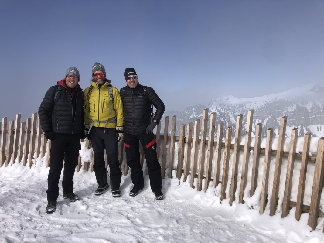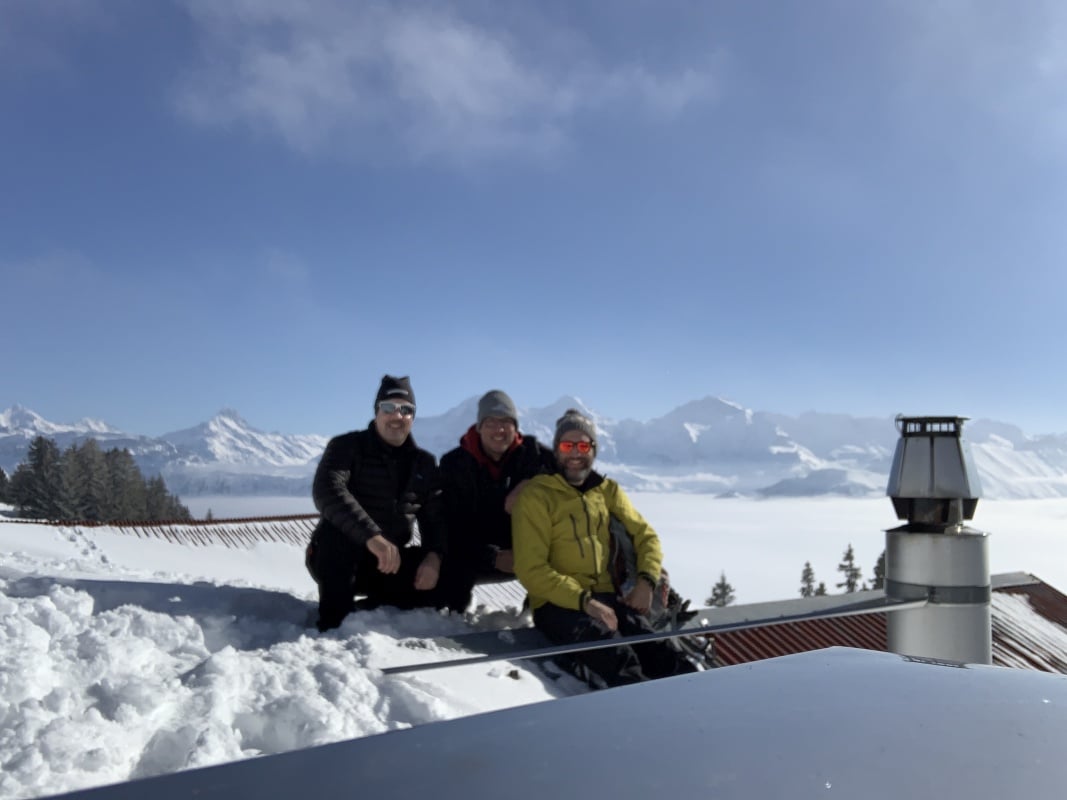Der Winter schlägt richtig zu und es ist bitter kalt an diesem nebligen Morgen. Doch gegen Mittag soll gemäss Meteo die Sonne kommen und danach richten wir uns zeitlich. So fahren wir erst um 11.00 Uhr bei dichtem Nebel mit der Seilbahn von Beatenberg auf das Niederhorn (1933 müM) hinauf. Wir beschliessen, auf die Sonne zu warten und vertreiben uns die Zeit in der Kälte mit einem warmen Kafi Zwätschge vom Take Away. Dabei lernen wir Ueli und Francoise kennen. Auch Sie warten auf die Sonne und es entstehen interessante Gespräche. Etwa um 12.30 Uhr ist es soweit und die Sonne durchdringt langsam den dichten Nebel. Dies ist für uns der Startschuss für unsere Winterwanderung Richtung Waldegg. Der breite Weg führt erst entlang dem Güggisgrat bis zum Weiler Oberburgfeld. Dort machen wir bei strahlendem Sonnenschein Mittagspause und bewundern das grossartige Panorama der hohen Berner Alpen. Kurz nach dem Oberburgfeld verlassen wir den