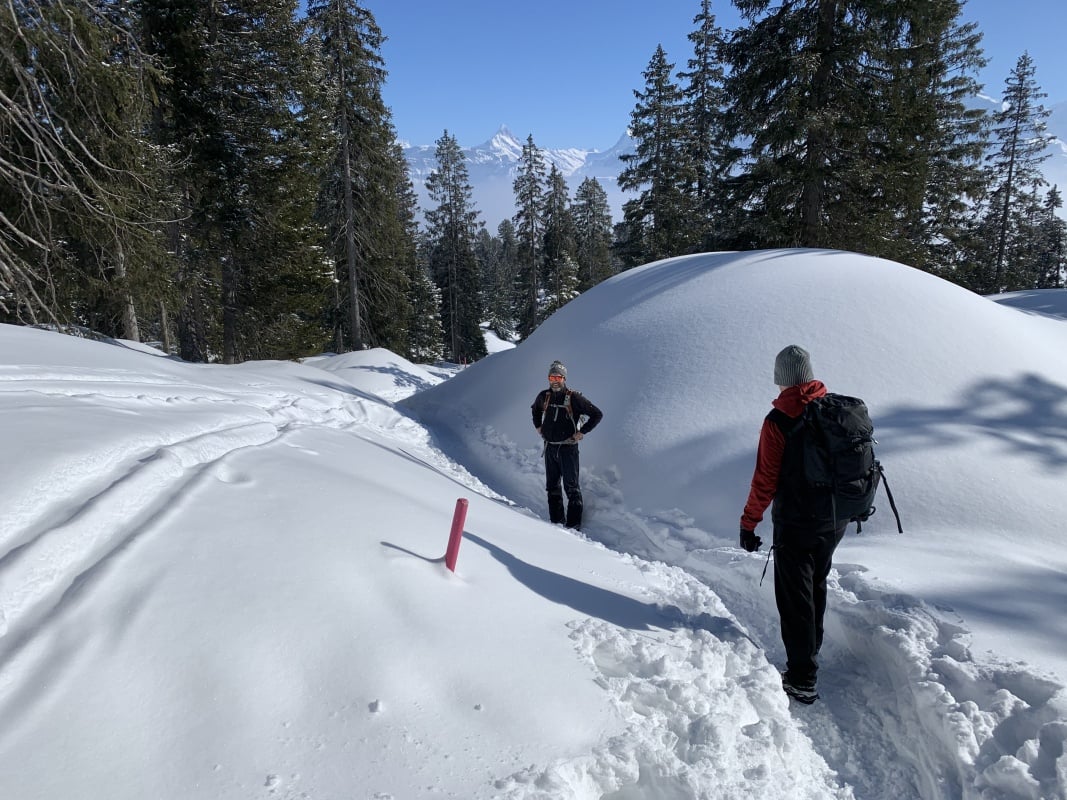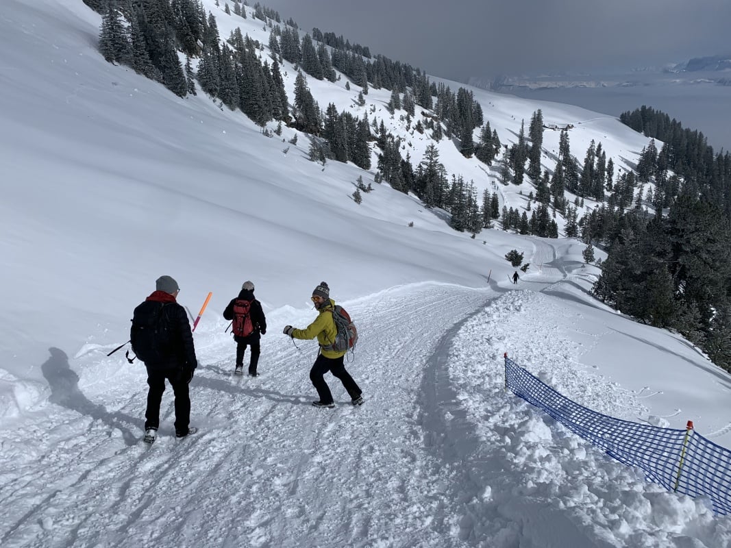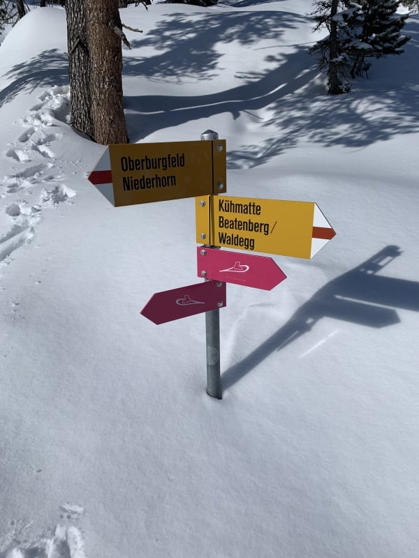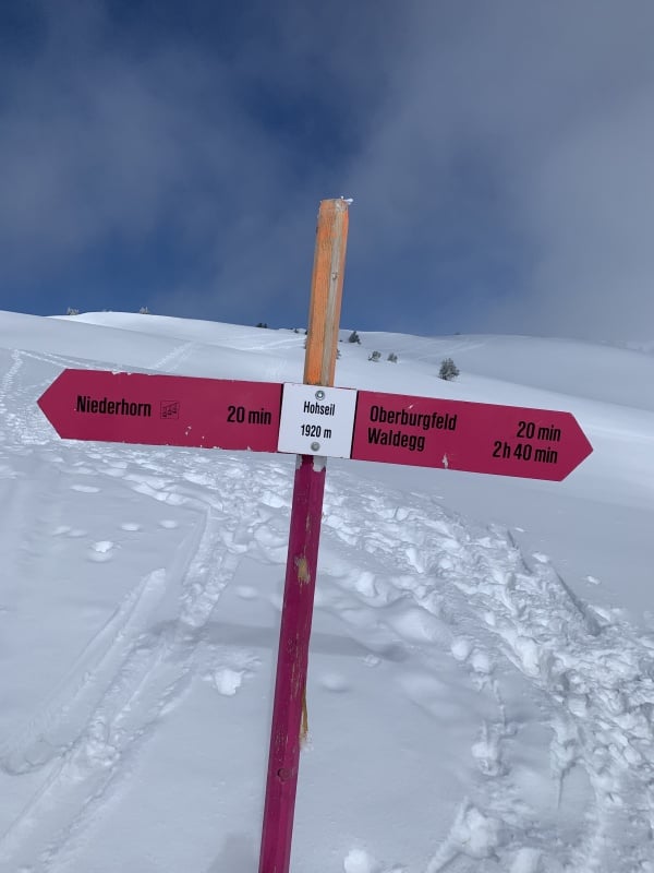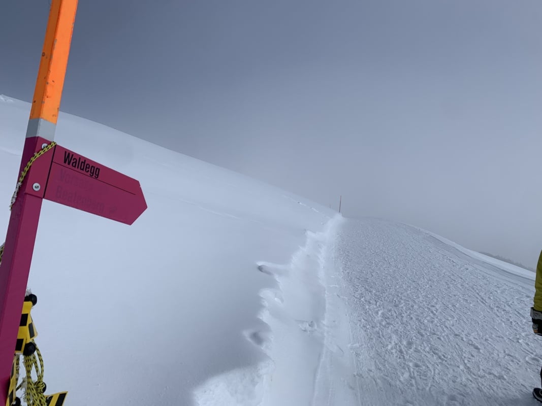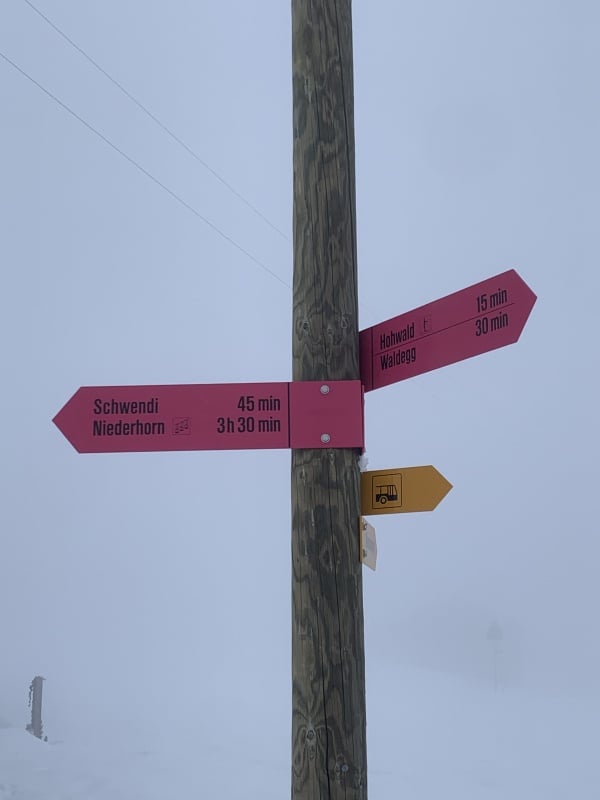 Winterwanderweg und wechseln auf den Schneeschuhtrail Richtung Chüematte. Der abwechslungsreiche Weg schlängelt sich durch Bäume und Felder und bietet immer wieder grossartige Ausblicke auf die umliegenden Berge. Nach der Chüematte steigen wir hinunter Richtung Schwendi, wo uns die kalte und graue Nebelsuppe wieder empfängt. Der Temperaturunterschied ist enorm. Unterwegs Richtung Waldegg hinunter werden wir fast von ein paar Schlittenfahrern umgefahren. Rechtzeitig ein kurzer Juchzer würde genügen und Wanderer und Schlittler könnten gefahrlos den gleichen Weg benützen. Der Weg endet schlussendlich genau bei der Postauto - Haltestelle Waldegg. Im Restaurant bei der Haltestelle kann man die Schlitten retournieren und es gibt ein Take Away mit warmen Getränken und Snacks. Während wir etwas trinken, stossen auch Ueli und Francoise wieder zu uns und spendieren uns ein feines Kafi Luz. Vielen herzlichen Dank nochmals an dieser Stelle.