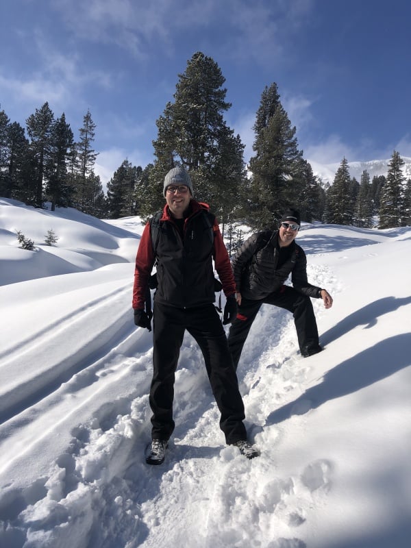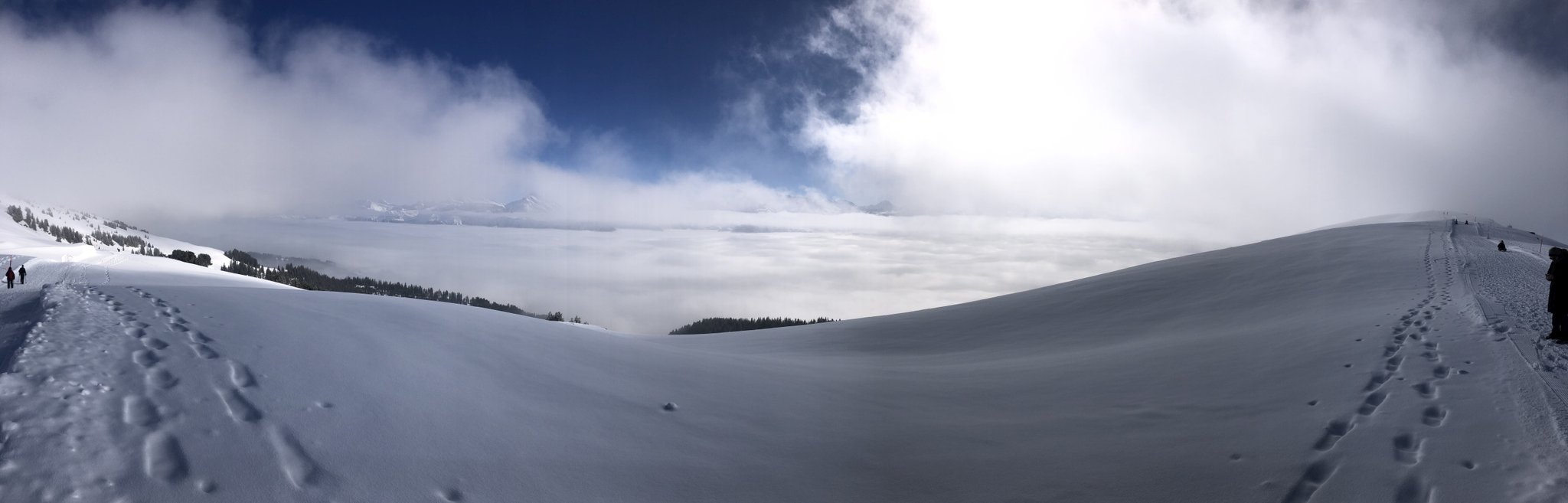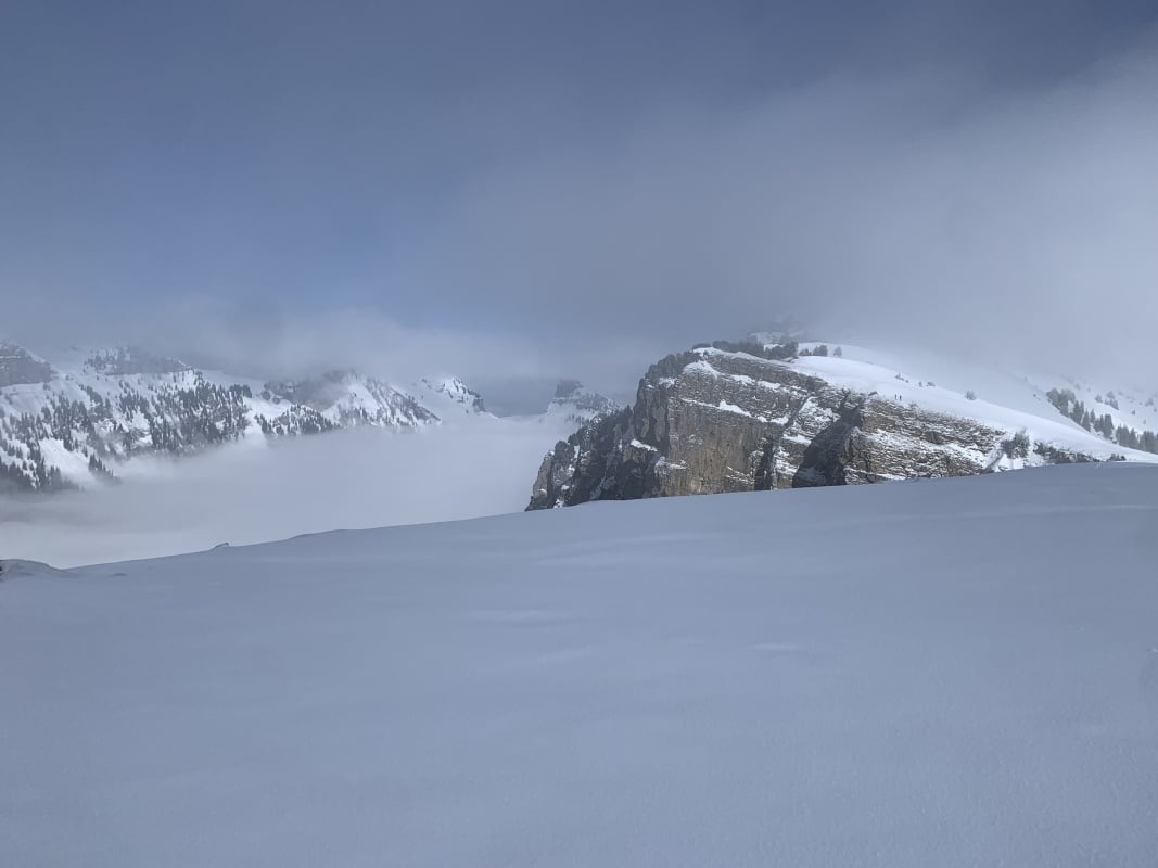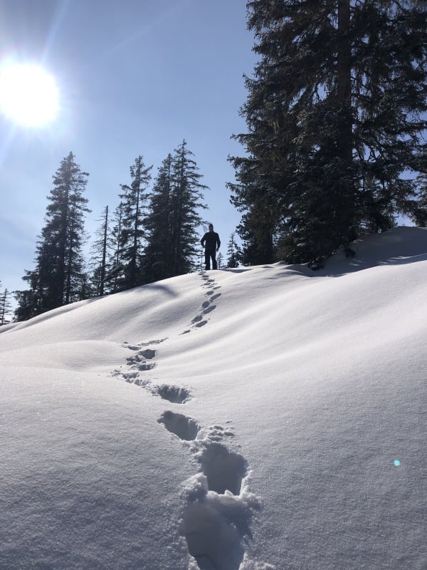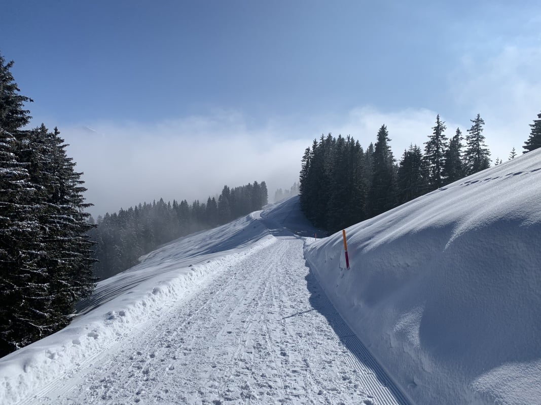 Winterwanderweg und wechseln auf den Schneeschuhtrail Richtung Chüematte. Der abwechslungsreiche Weg schlängelt sich durch Bäume und Felder und bietet immer wieder grossartige Ausblicke auf die umliegenden Berge. Nach der Chüematte steigen wir hinunter Richtung Schwendi, wo uns die kalte und graue Nebelsuppe wieder empfängt. Der Temperaturunterschied ist enorm. Unterwegs Richtung Waldegg hinunter werden wir fast von ein paar Schlittenfahrern umgefahren. Rechtzeitig ein kurzer Juchzer würde genügen und Wanderer und Schlittler könnten gefahrlos den gleichen Weg benützen. Der Weg endet schlussendlich genau bei der Postauto - Haltestelle Waldegg. Im Restaurant bei der Haltestelle kann man die Schlitten retournieren und es gibt ein Take Away mit warmen Getränken und Snacks. Während wir etwas trinken, stossen auch Ueli und Francoise wieder zu uns und spendieren uns ein feines Kafi Luz. Vielen herzlichen Dank nochmals an dieser Stelle.