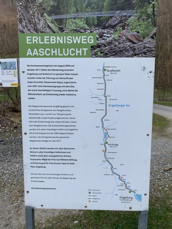 Die Aaschlucht ab Grafenort bis Engelberg bietet sehr viel. So gibt es diverse schön hergerichtete Grillplätze in der schattigen Schlucht und tolle Stahlbrücken. Eine zusätzliche Attraktion ist die fast 100jährige Wasserballast - Seilbahn auf die Alp Zingel. Die Fahrt ist allerdings nur für Materialtransporte zugelassen. Aktuell (Frühling 2021) ist der offizielle Weg durch die Aaschlucht wegen Unwetterschäden schwierig begehbar und teilweise ganz gesperrt.