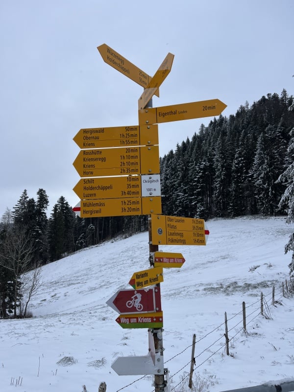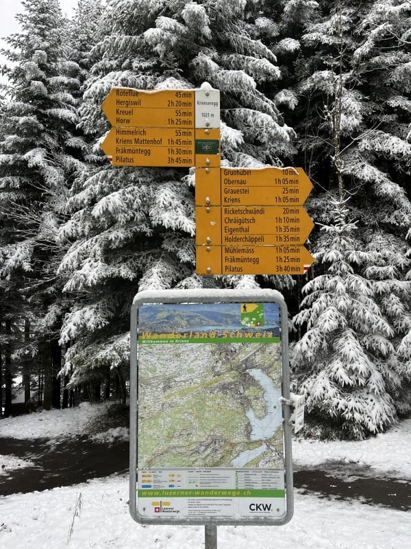 Wir treffen uns an diesem kalten Morgen bei der Talstation der Pilatusbahnen und fahren mit der Gondelbahn auf die Krienseregg. Nach einem kurzen Kaffeehalt wandern wir los Richtung Dorschnei. Danach weiter über den Chräigütsch bis nach Eigenthal.